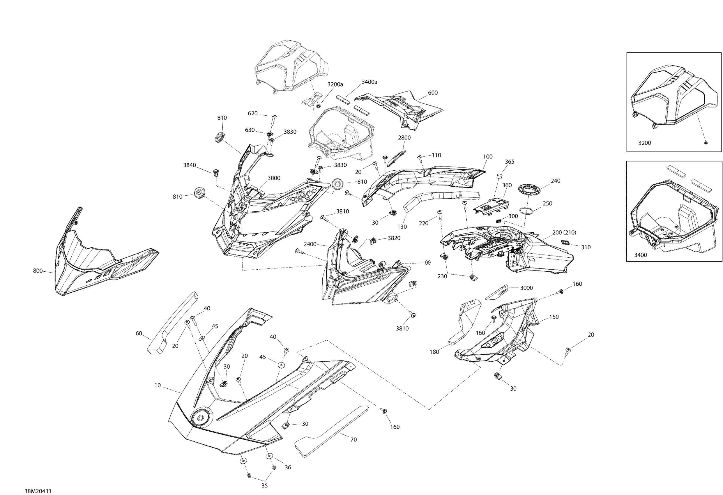 Ski-Doo 001 - FREERIDE 137 850 E-TEC - North America, 2020 09- Body - Hood Section - Bright White - Electric Start Diagram