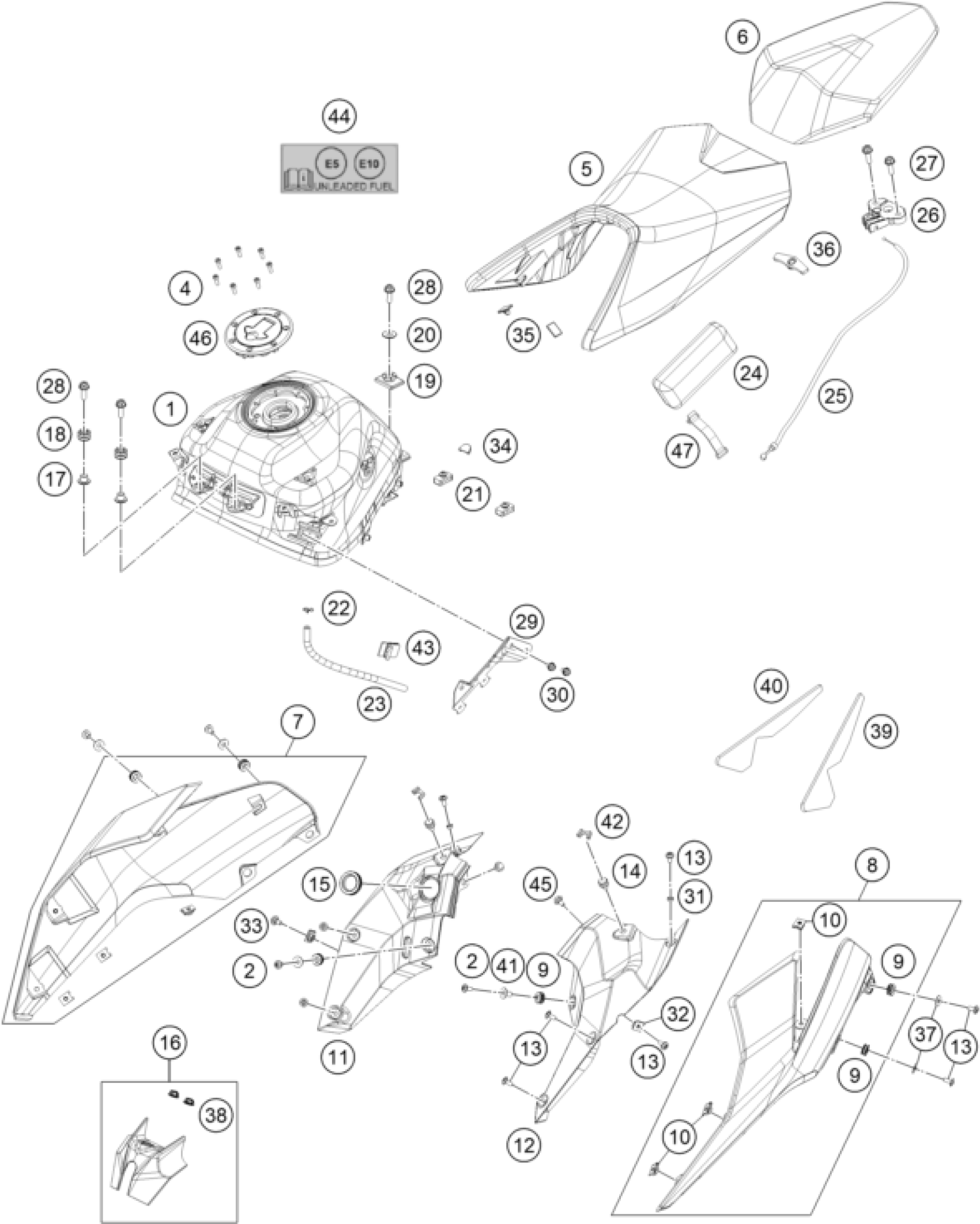 KTM 200 DUKE, white, w/o ABS - B.D. 2025 TANK, SEAT Diagram