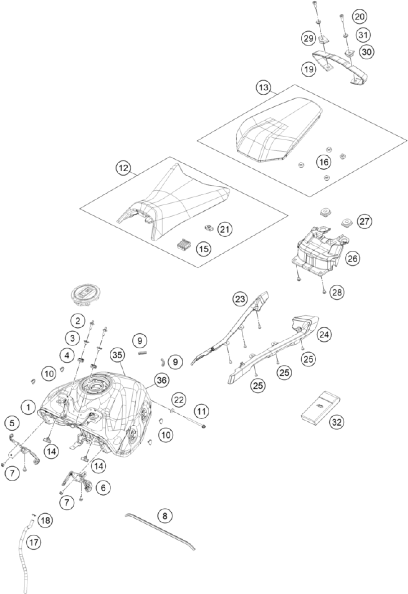KTM 390 DUKE, orange 2025 TANK, SEAT Diagram