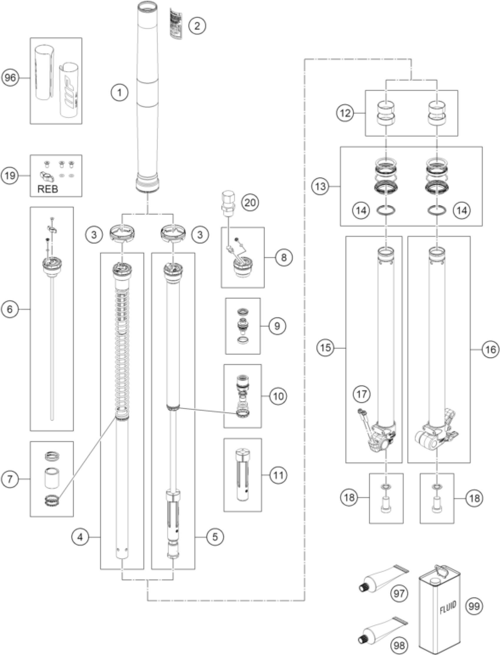 KTM 65 SX 2026 FRONT FORK DISASSEMBLED Diagram