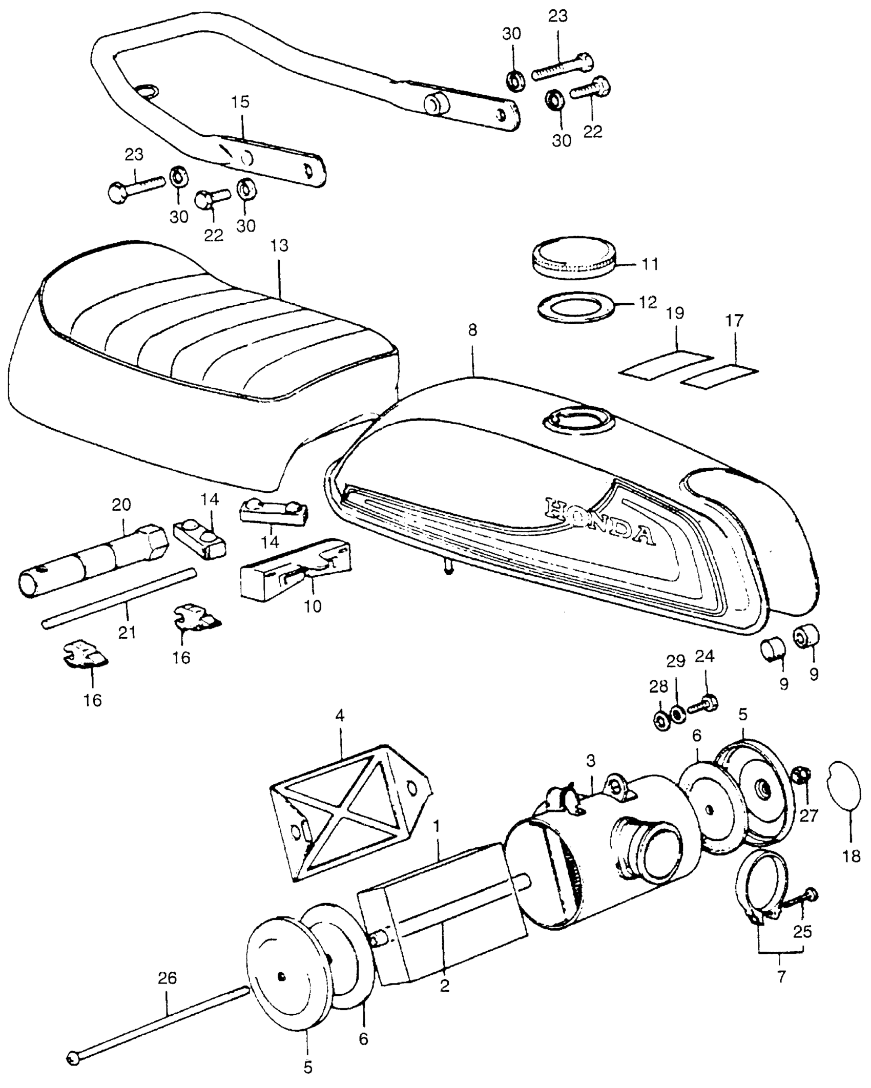 Honda ATC70A ALL-TERRAIN, JPN, VIN# ATC70-1000001 FUEL TANK + SEAT + AIR CLEANER Diagram