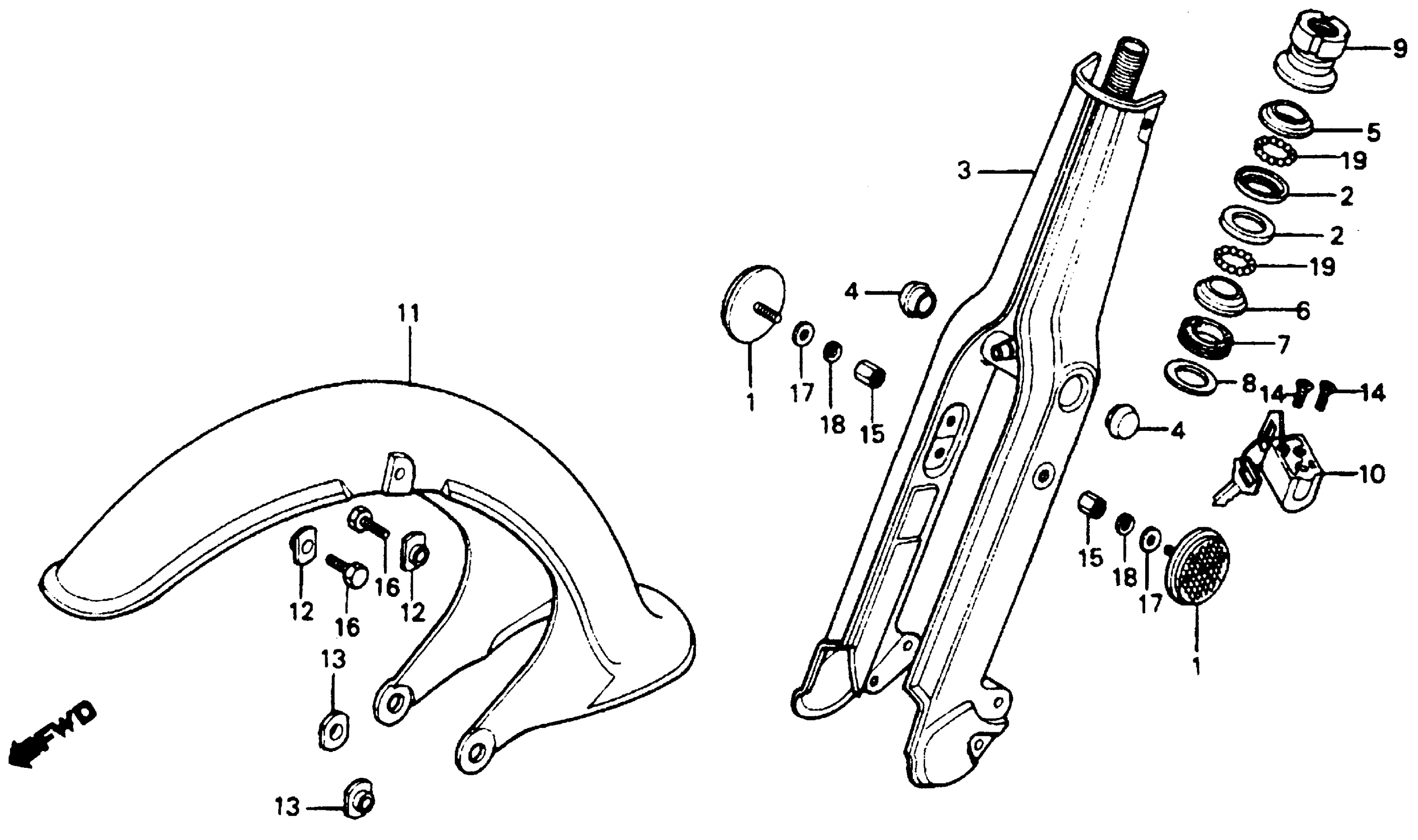 Honda C70A (81) PASSPORT, JPN, VIN# JH2DA010-BS100003 TO JH2DA010-BS136772 FRONT FORK + FRONT FENDER Diagram
