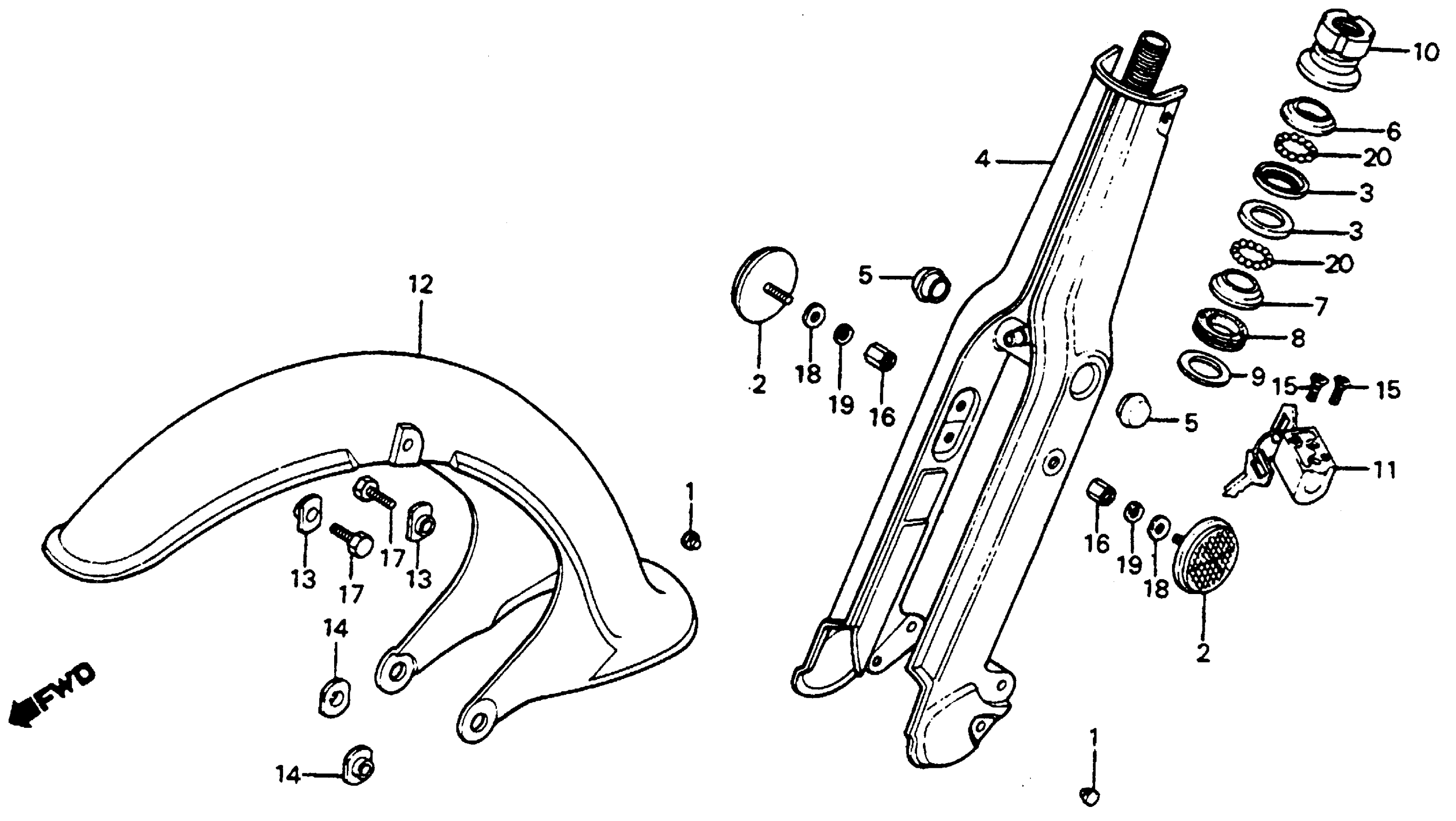 Honda C70A (83) PASSPORT, JPN, VIN# JH2DA010-DS300004 TO JH2DA010-DS308543 FRONT FORK + FRONT FENDER Diagram