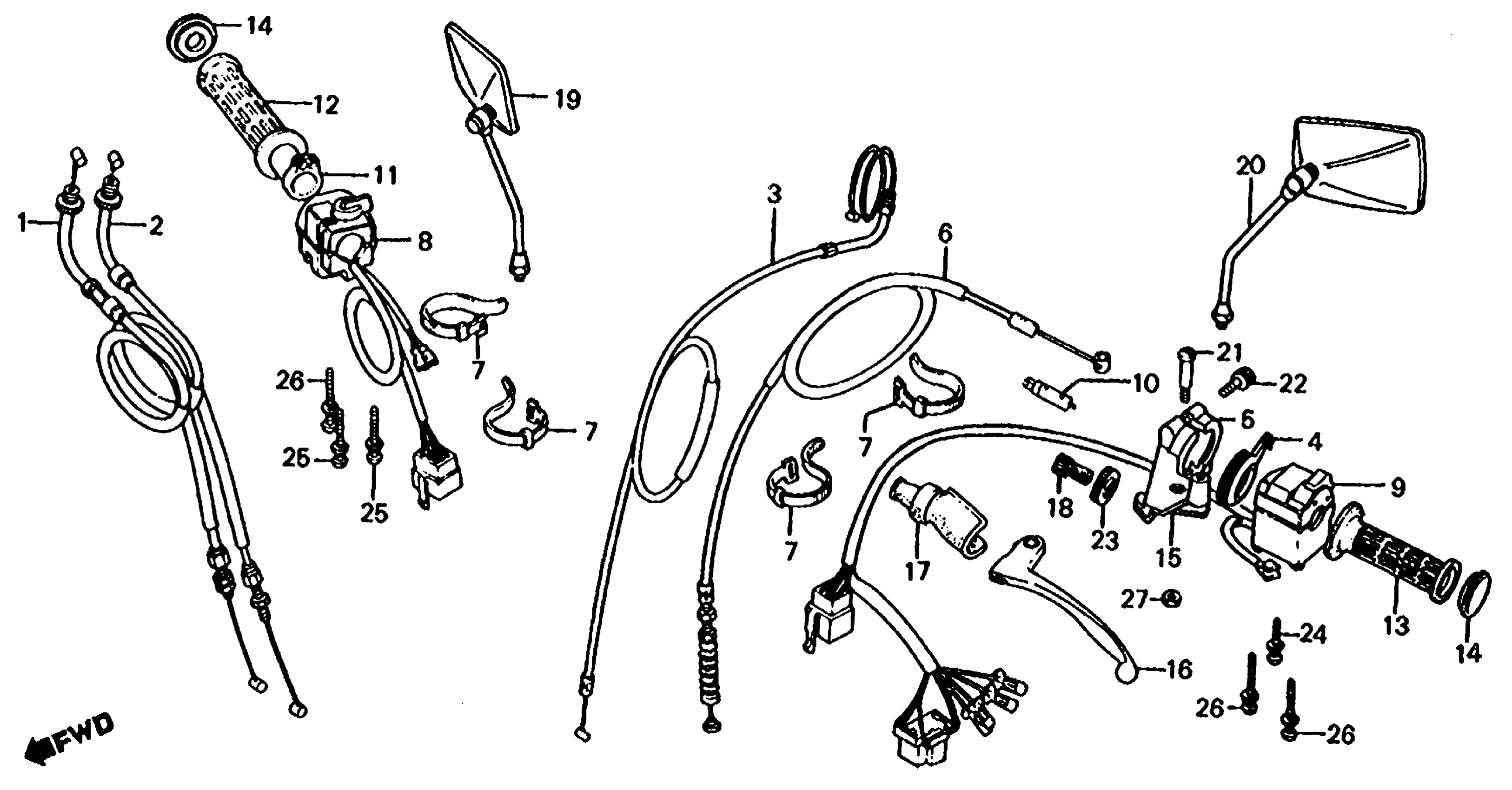 Honda CB1000CA (83) 1000 CUSTOM, JPN, VIN# 1HFSC100-DA000001 TO 1HFSC100-DA007620 CONTROL LEVERS + SWITCHES + CABLES Diagram
