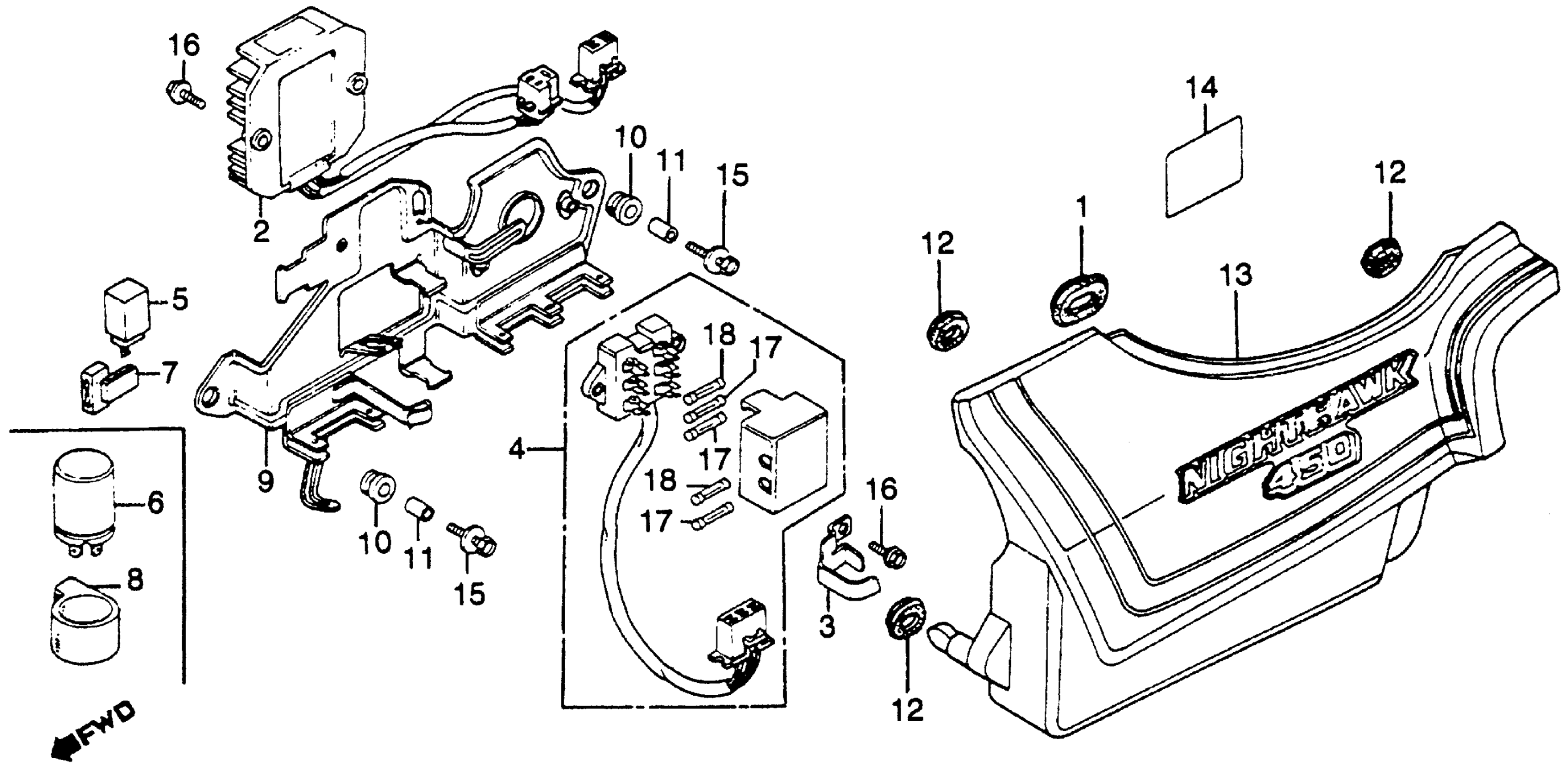 Honda CB450SCAC (86) NIGHTHAWK 450, JPN, VIN# JH2PC055-GM400004 LEFT SIDE COVER + RECTIFIER + FUSE Diagram