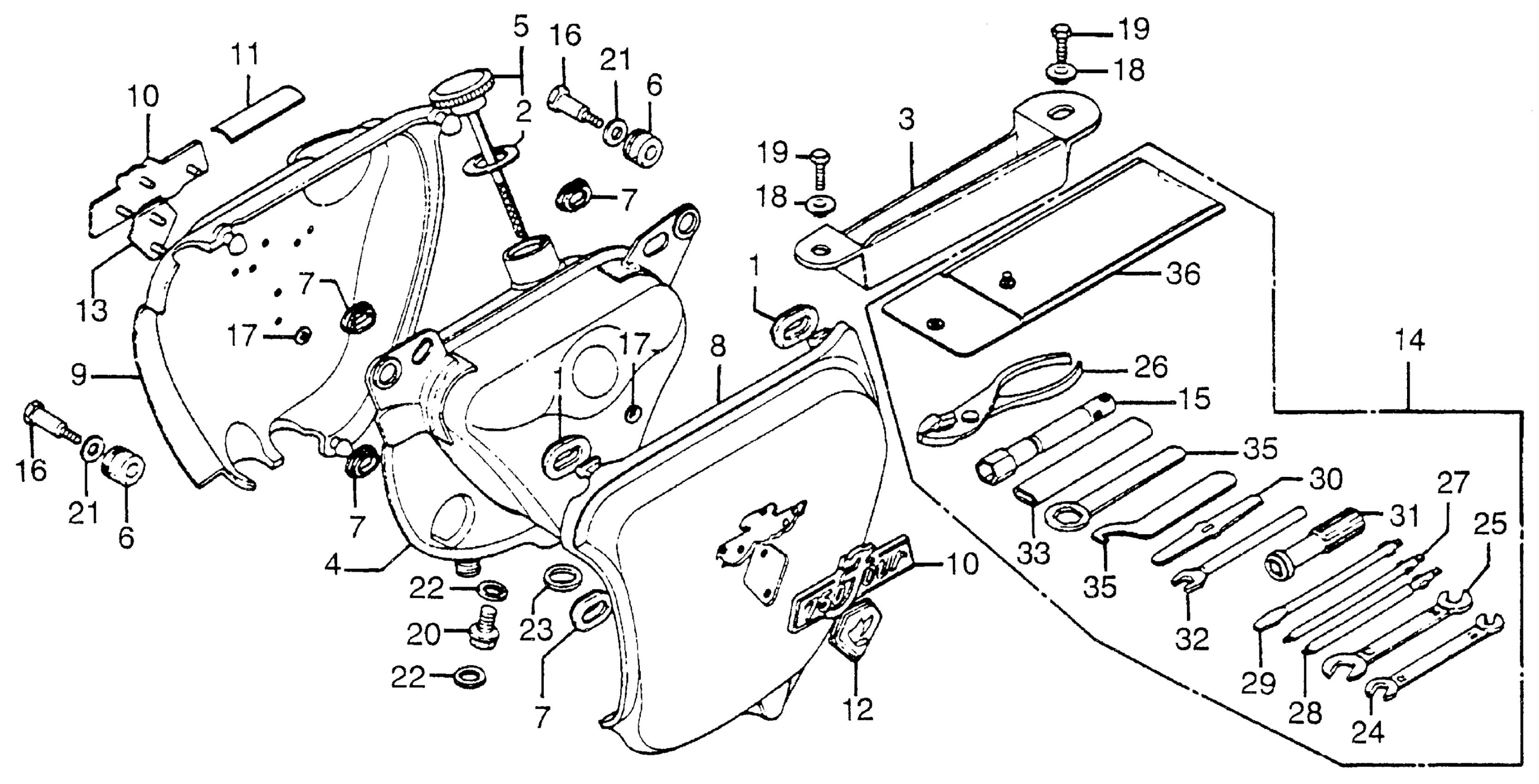 Honda CB750KA (76) 750 FOUR, JPN, VIN# CB750-2540001 TO CB750-2575894 BATTERY COVER + OIL TANK COVER + TOOLS Diagram