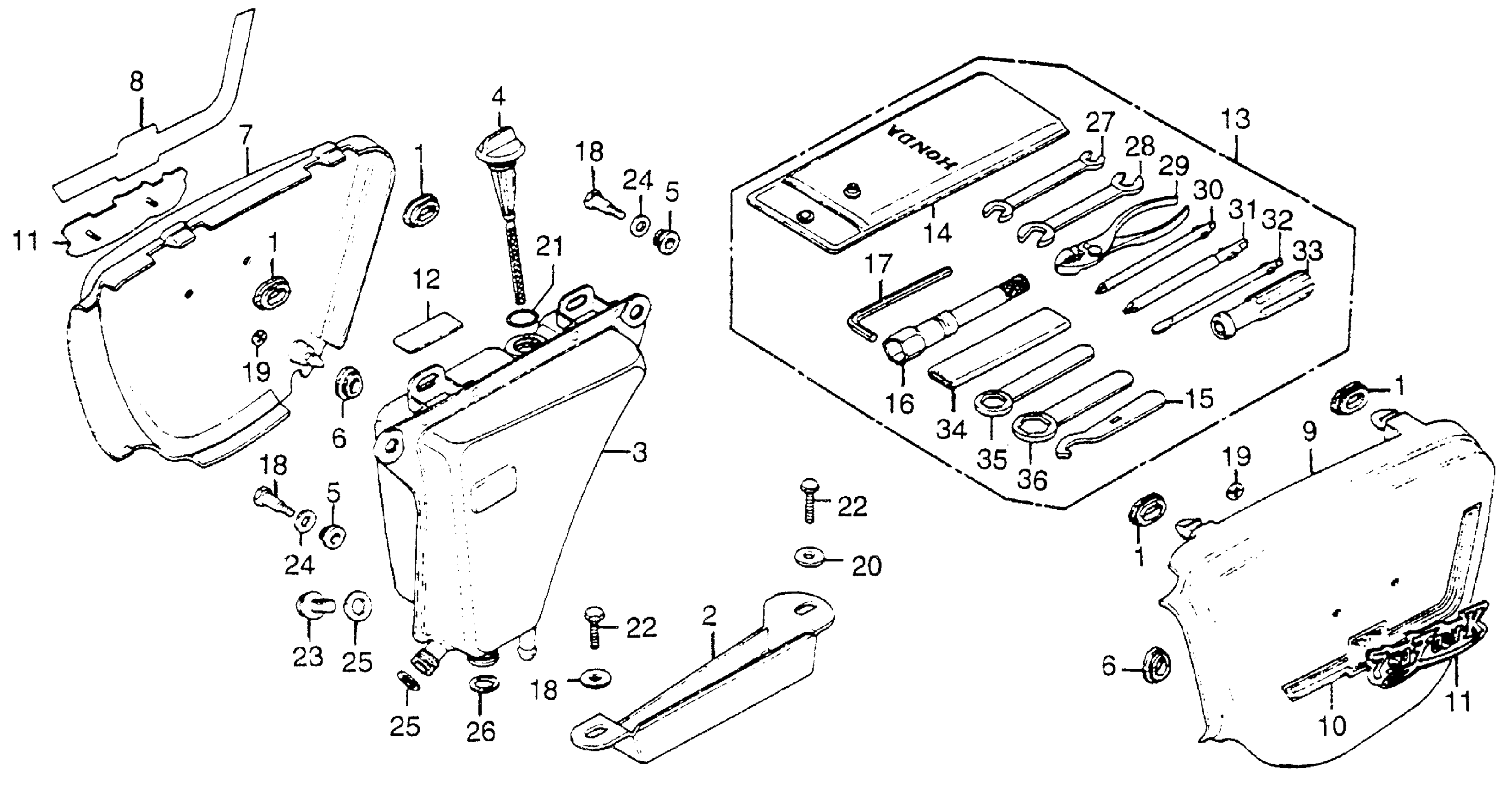 SIDE COVER + OIL TANK + TOOLS