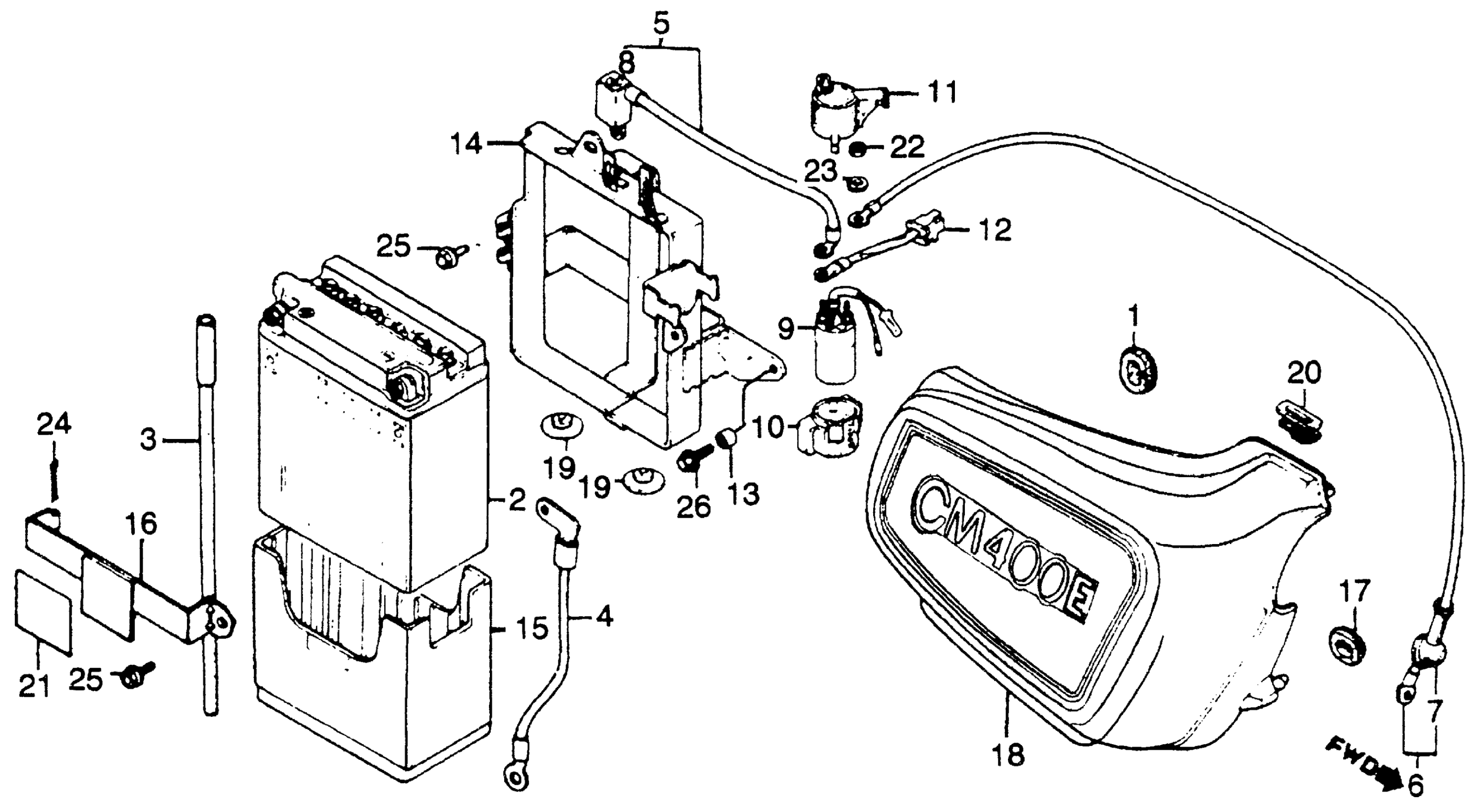 Honda CM400EA (81) MOTORCYCLE, JPN, VIN# JH2NC011-BM100001 TO JH2NC011-BM113694 RIGHT SIDE COVER + BATTERY Diagram