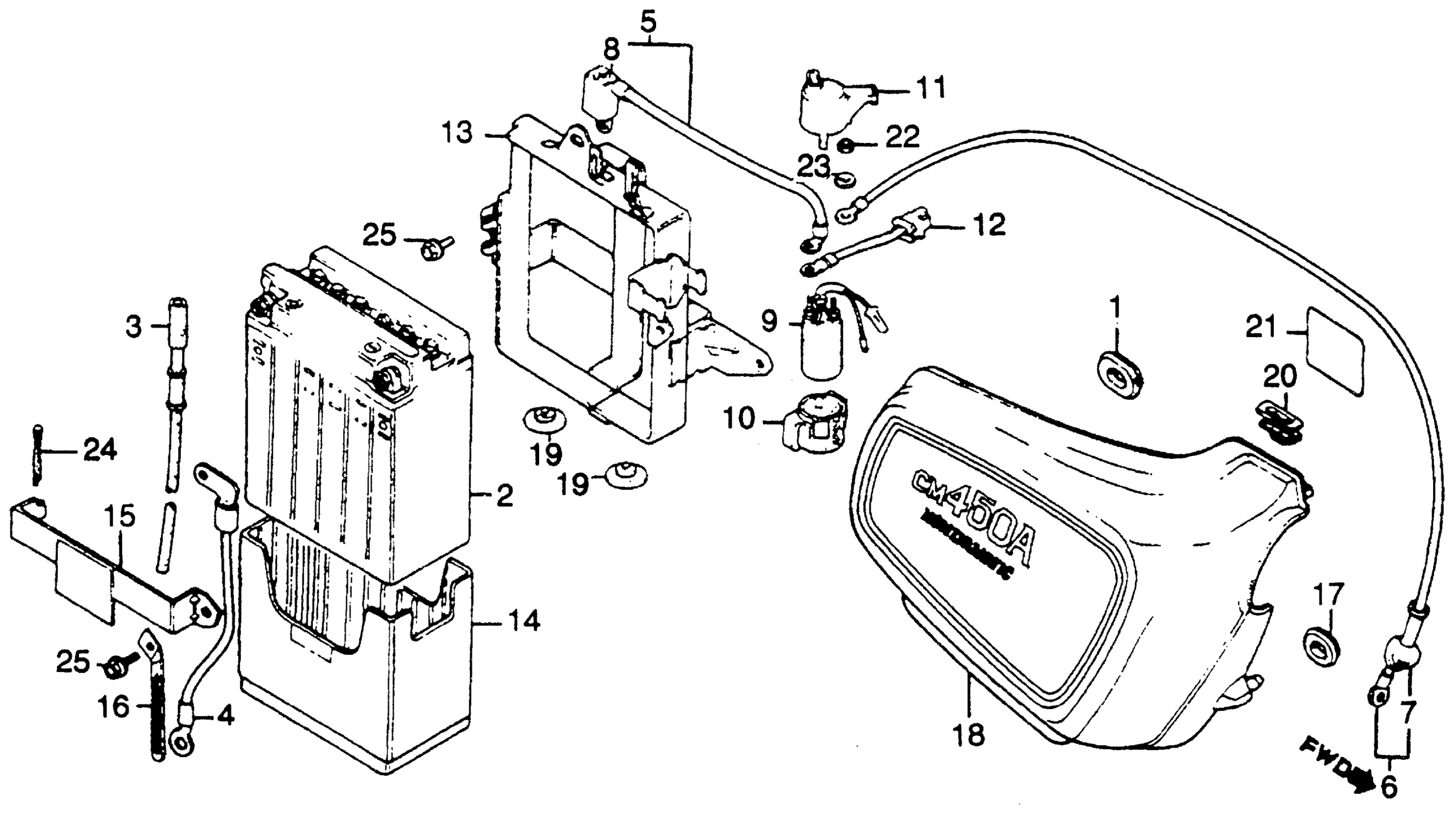 Honda CM450CA (82) CUSTOM, JPN, VIN# JH2PC051-CM000001 TO JH2PC051-CM011076 RIGHT SIDE COVER + BATTERY Diagram
