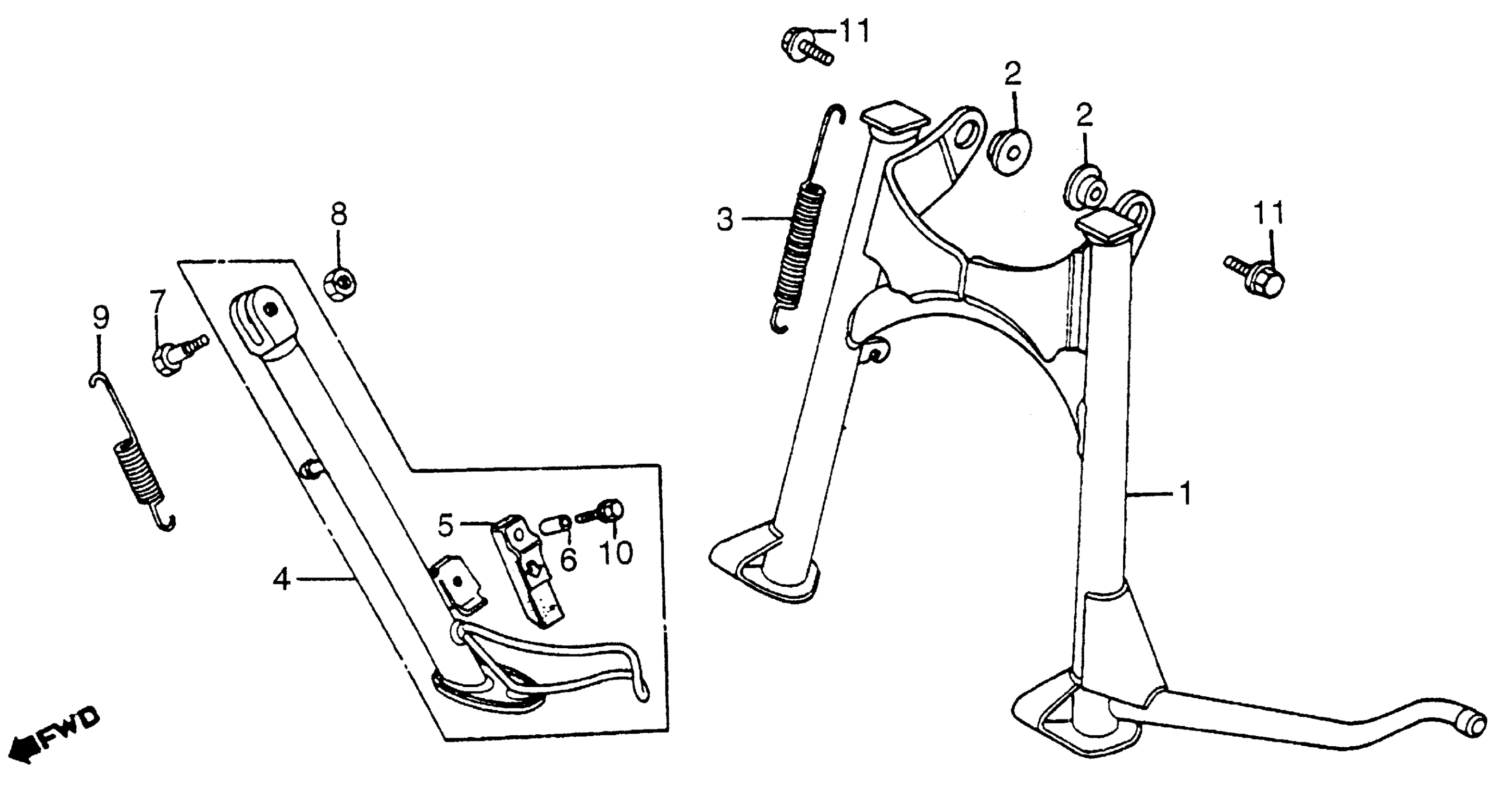 Honda CX650CA (83) CUSTOM, JPN, VIN# JH2RC110-DM000018 TO JH2RC110-DM010120 MAIN STAND + SIDE STAND Diagram