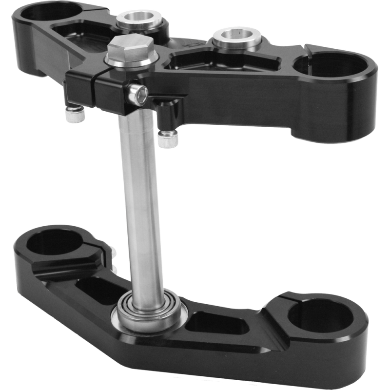 Crafted with a sleek black anodized finish, these triple trees not only perform exceptionally but also elevate the aesthetic of your motorcycle. They are designed to accept stock fairings or fork covers, making them versatile for various configurations. Whether you're a casual rider or a performance enthusiast, these trees adapt to your needs.