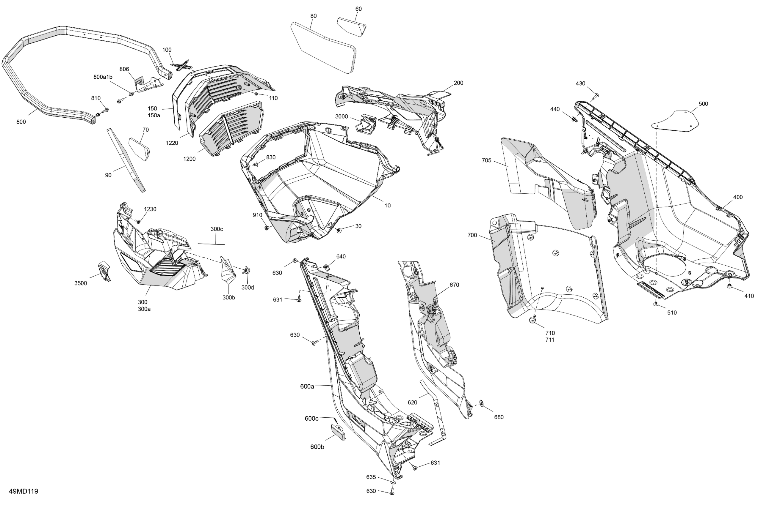 Ski-Doo Europe - MXZ 600R E-TEC - X-RS - MZRP - Hyper Silver - 129X15X1.5IR Track, 2024 07- Body - Bottom Pan Diagram