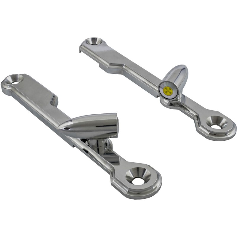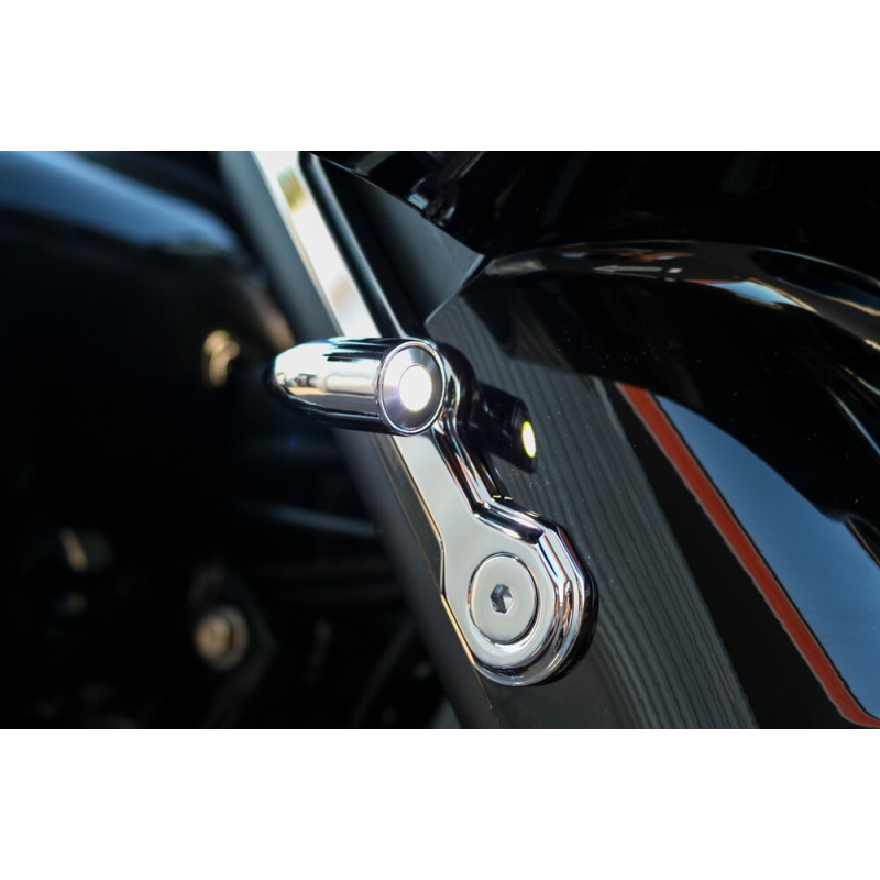 Bagger Nations New Lightning Bullet Kit for Street Glide’s creates a totally unique custom look and increases visibility! Our direct bolt-on bullet shaped turn signals are as small as a dime yet incredibly powerful. Bagger Nations “Switchback” technology transforms your bulky, mundane stock units into laser bright daytime running lights that change to an unbelievably bright amber turn signal and then “Switchback” to daytime running lights when signal cycle ceases. Each kit is CNC machined from 6061-T6 Aluminum and available in chrome or gloss black. Simple instructions and mounting hardware included.