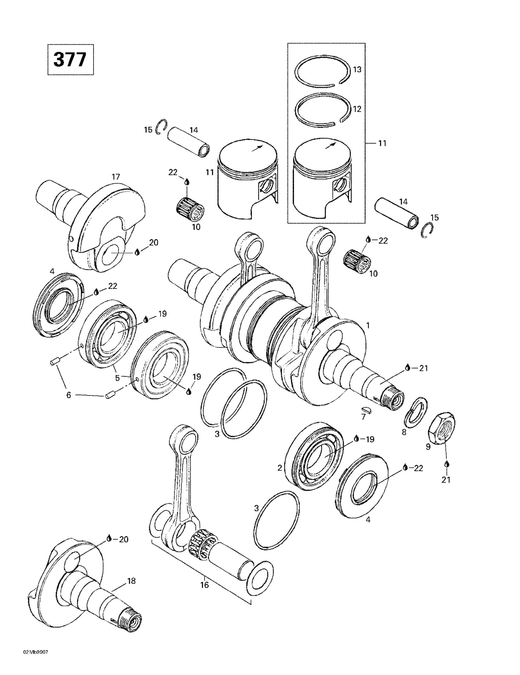 Ski-Doo Formula Deluxe 380/500, 1999 Crankshaft And Pistons (377) Diagram
