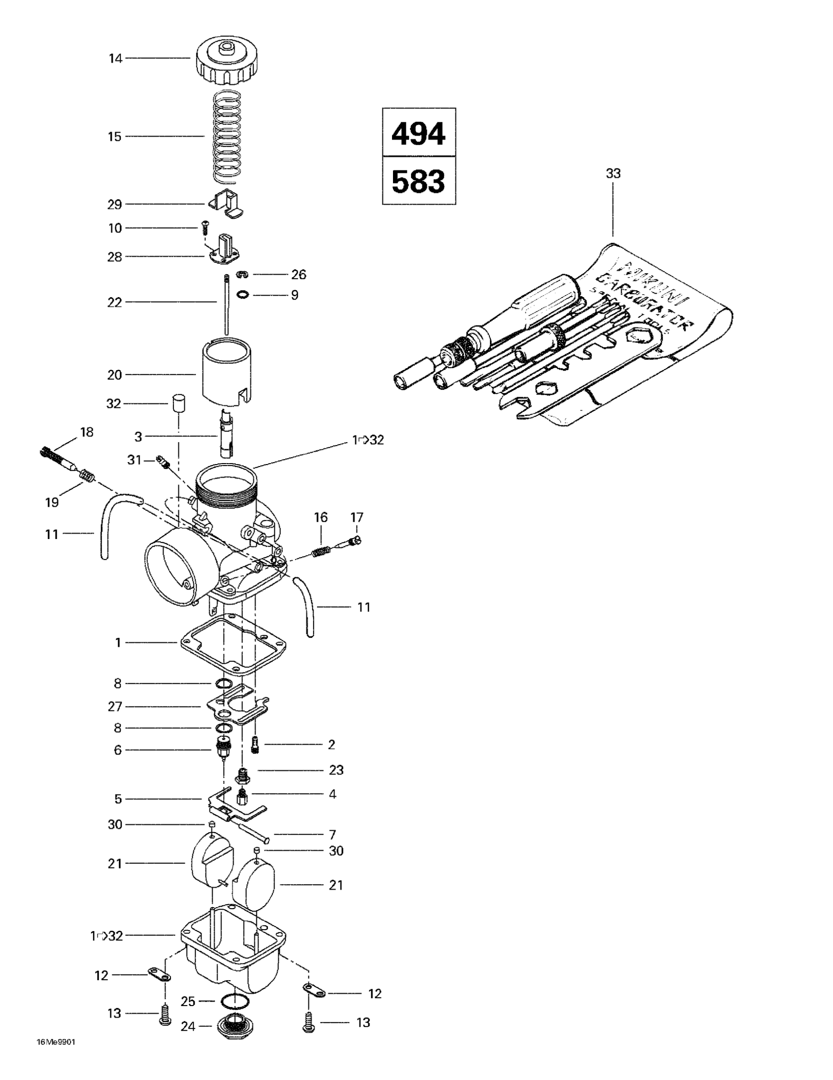 Ski-Doo Formula Deluxe 500 LC/583/670, 1999 Carburetors (494, 583) Diagram