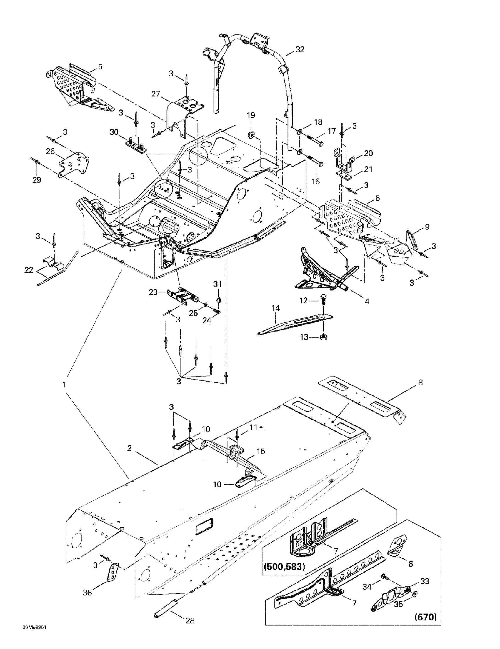 Ski-Doo Formula Deluxe 500 LC/583/670, 1999 Frame And Accessories Diagram