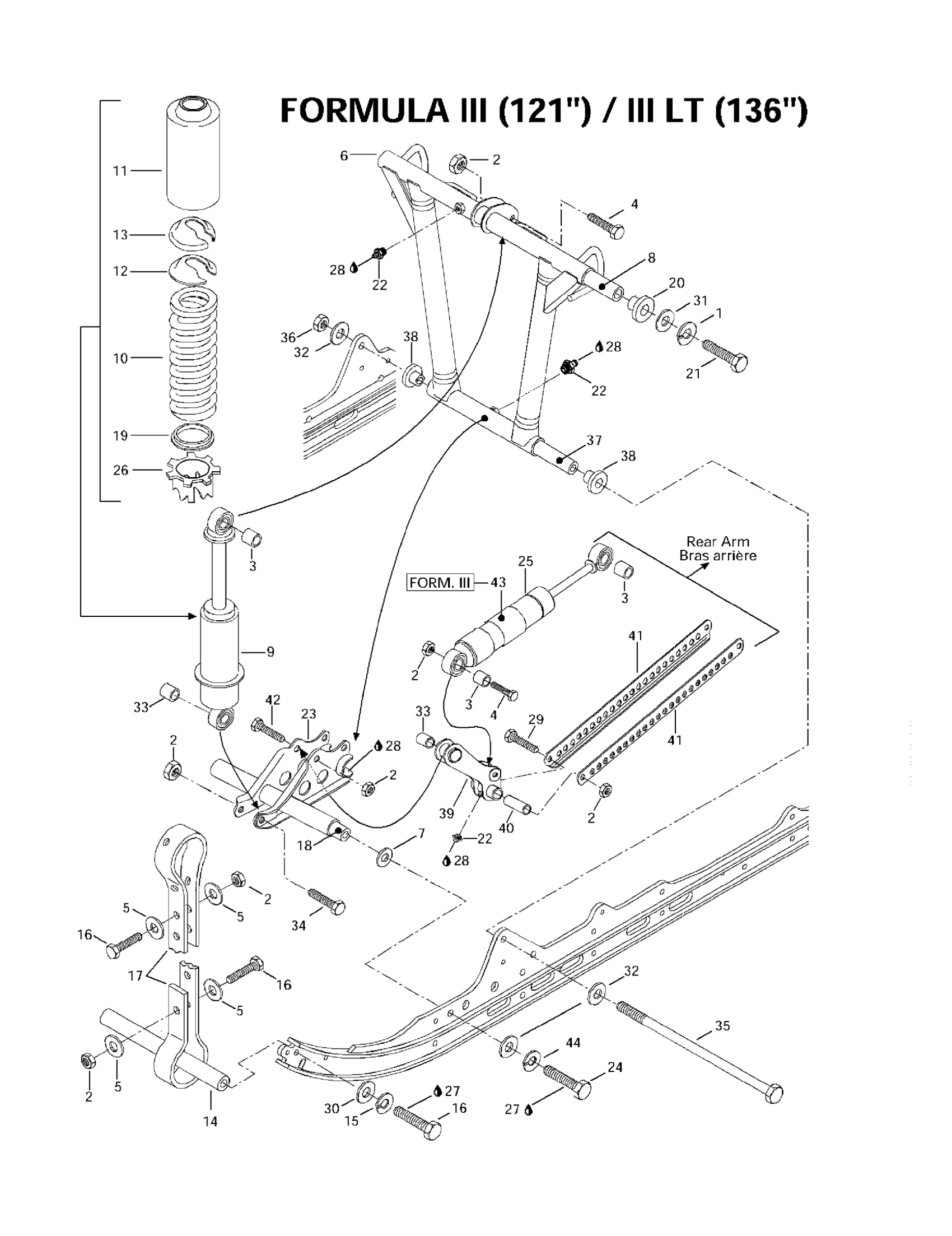 Ski-Doo Formula III LT, 1997 Front Arm, Rear Suspension 121”-136” Diagram