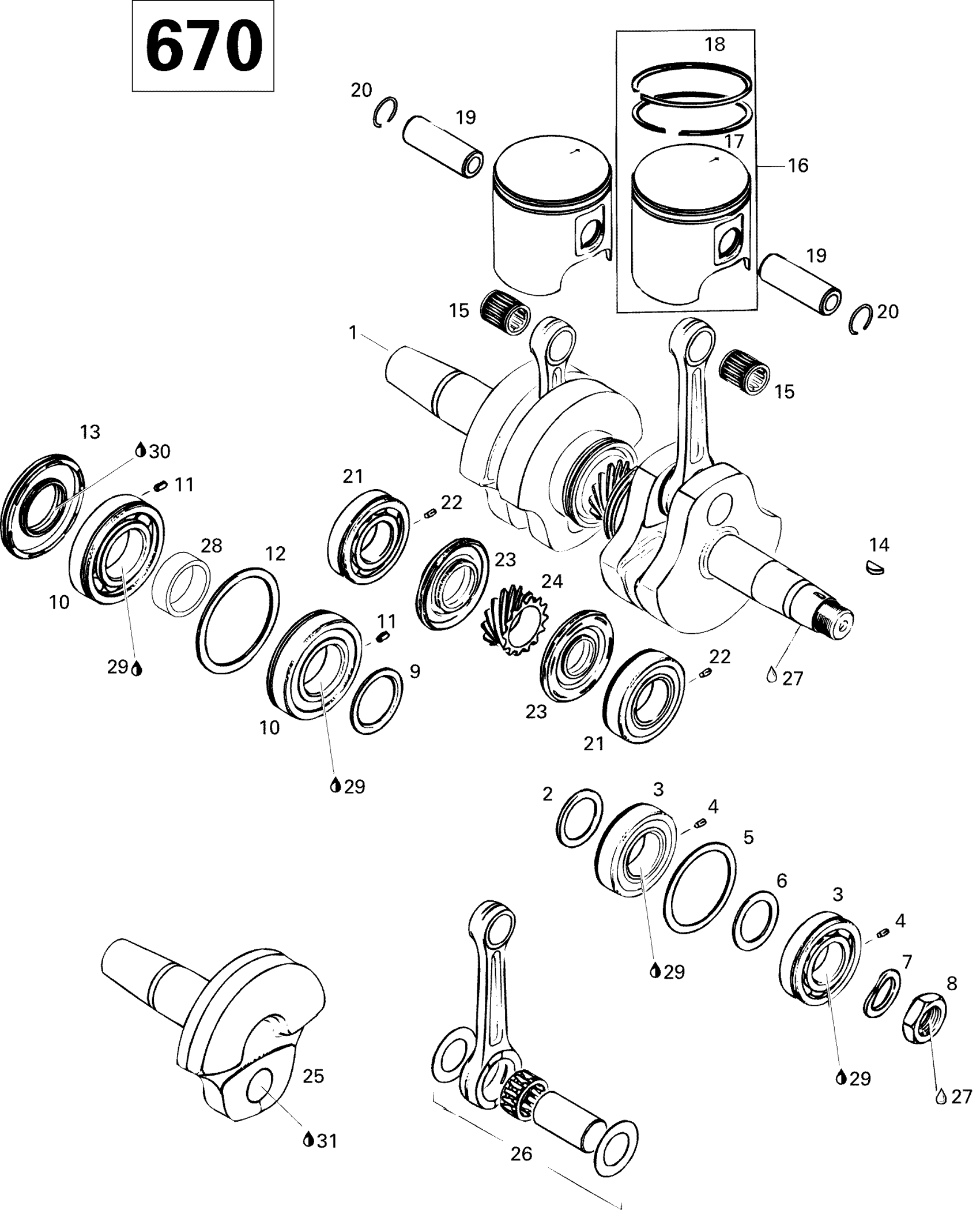 Ski-Doo Formula SS, 1996 Crankshaft And Pistons 670 Diagram