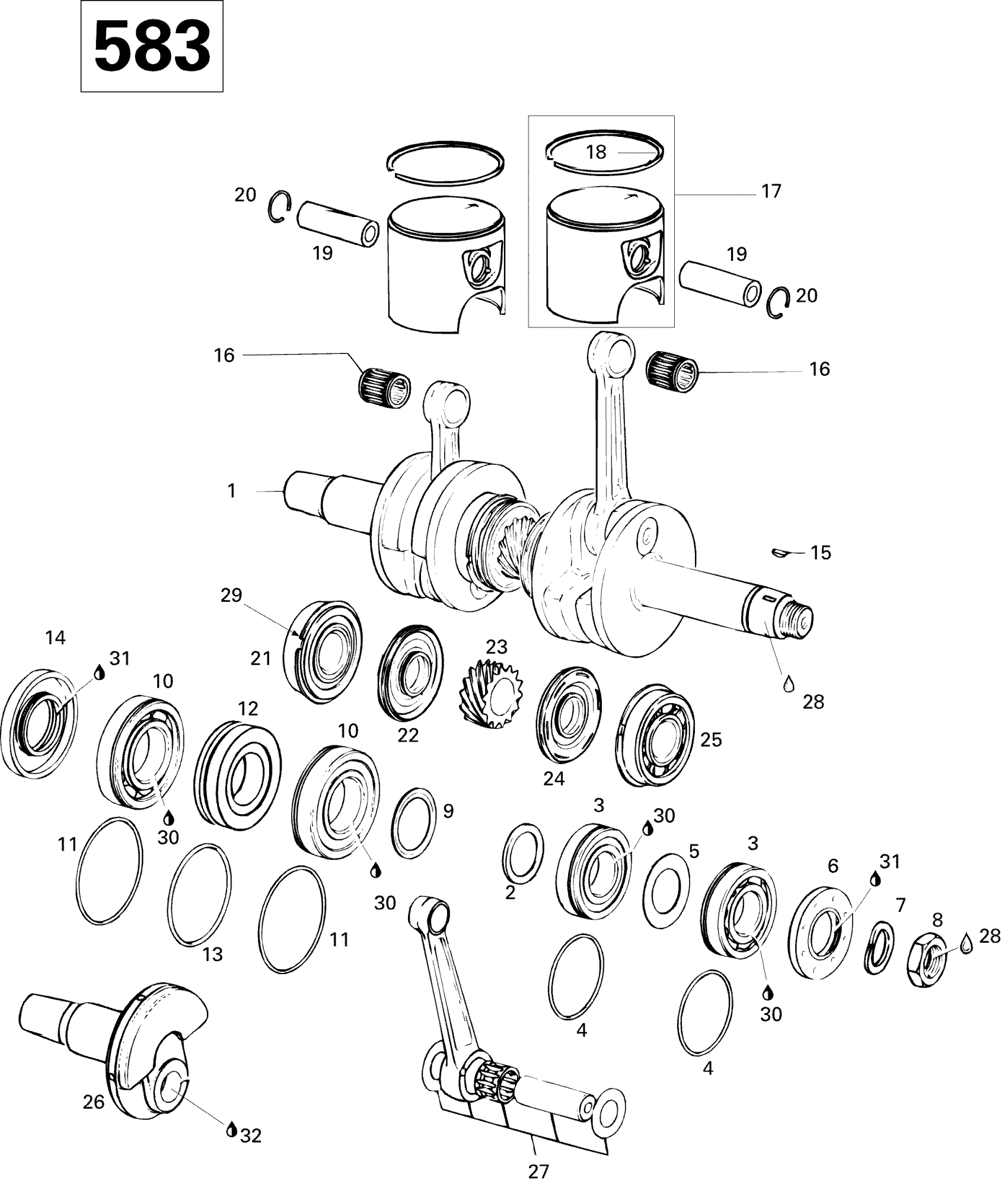 Ski-Doo Formula Z, 1996 Crankshaft And Pistons 583 Diagram