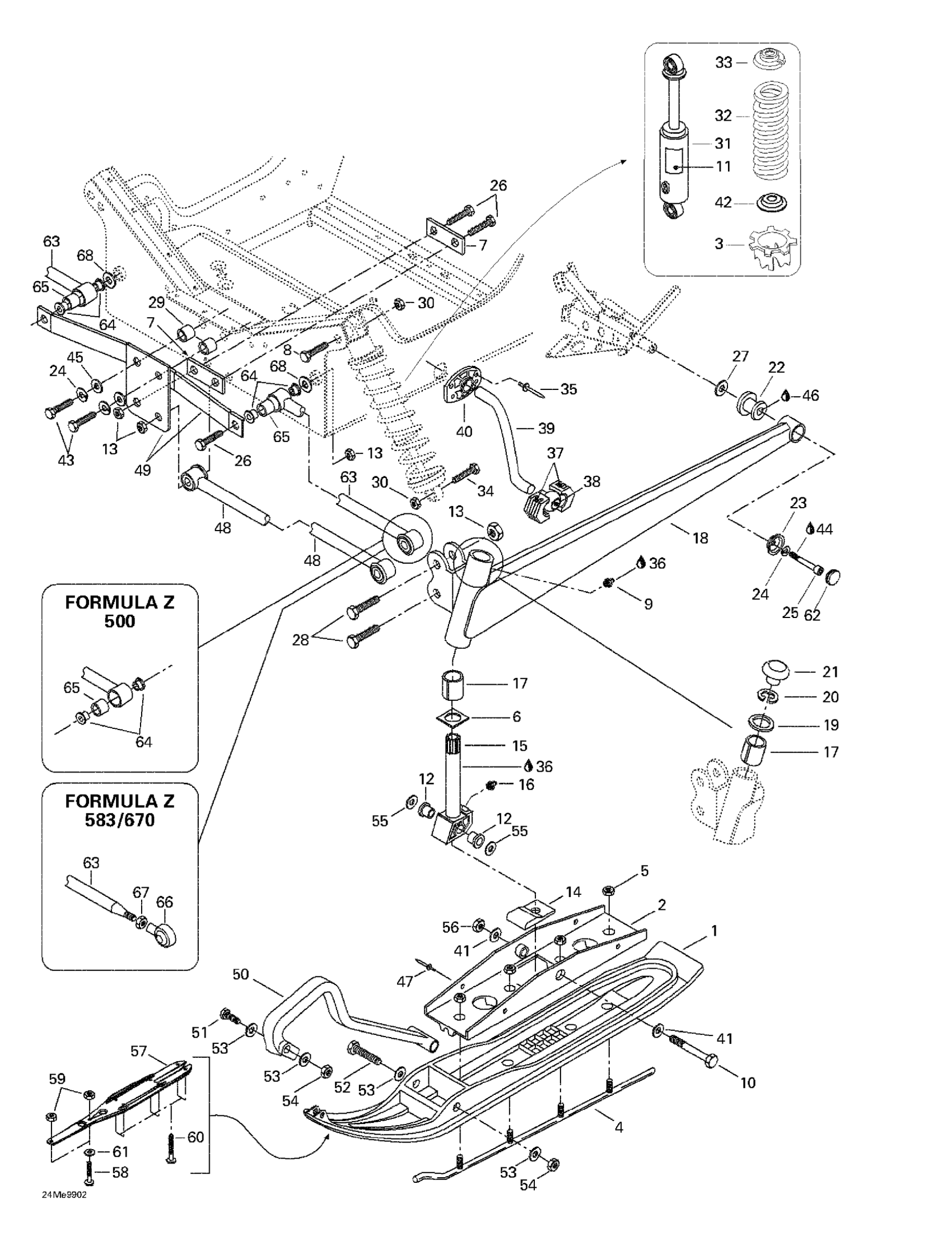 Ski-Doo Formula Z 500/583/670, 1999 Front Suspension And Ski Diagram