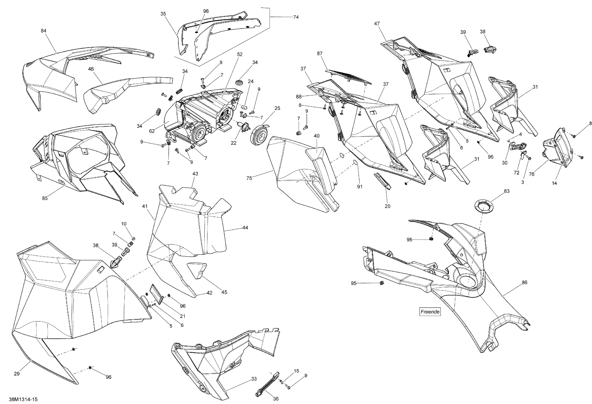 Ski-Doo FREERIDE 154R, 800RE XP, 2013 09- Hood, Windshield And Console Diagram
