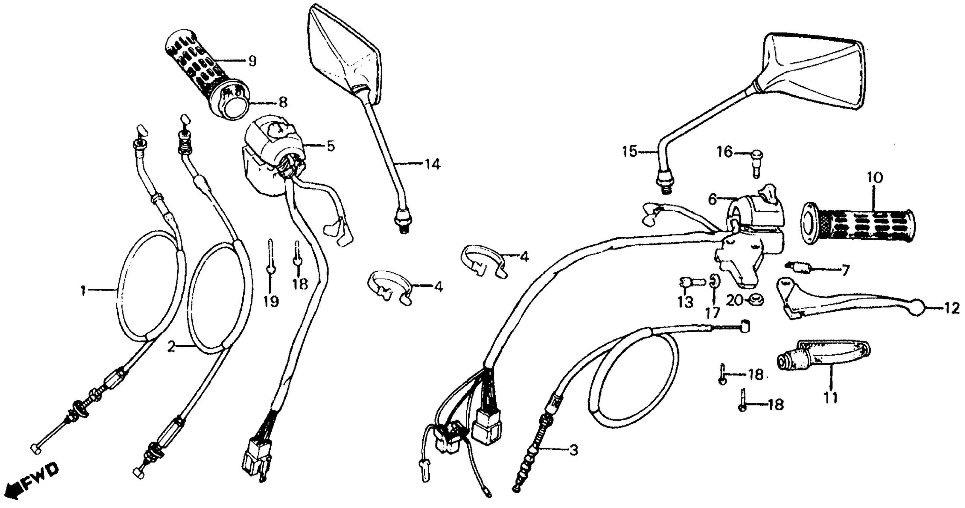 Honda FT500A (83) ASCOT, JPN, VIN# JH2PC070-DM000001 TO JH2PC070-DM002498 CONTROL LEVERS + CABLES + SWITCHES Diagram