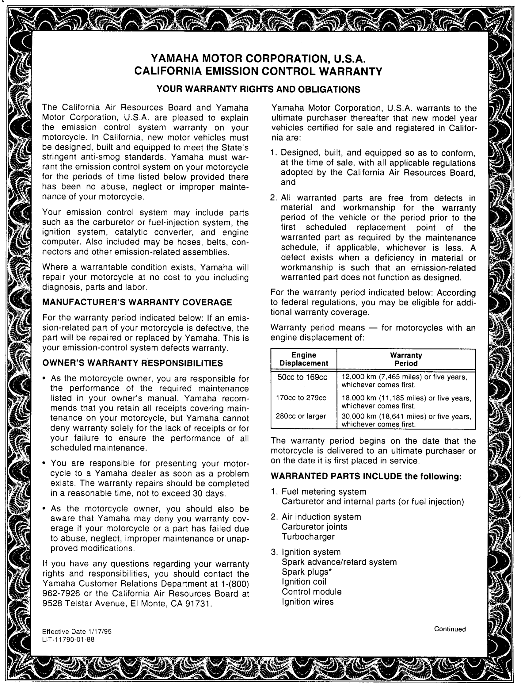 Yamaha FZR600RHC (FZR600R CA) 1996 AUDIO WARRANTY SERVICE PG 2 Diagram