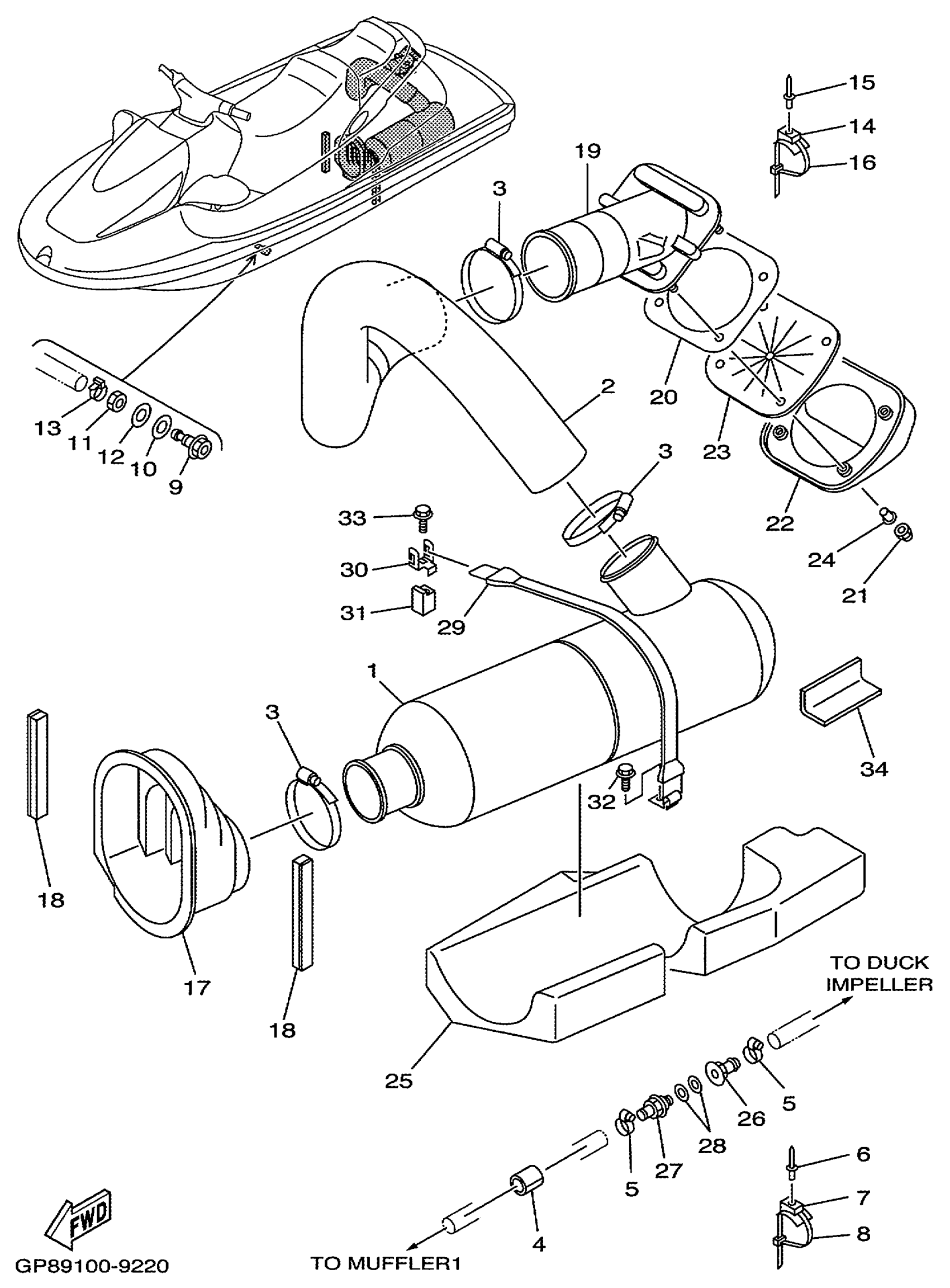 Yamaha GP1200X (WAVE RUNNER GP1200) GP89 1999 EXHAUST 2 Diagram