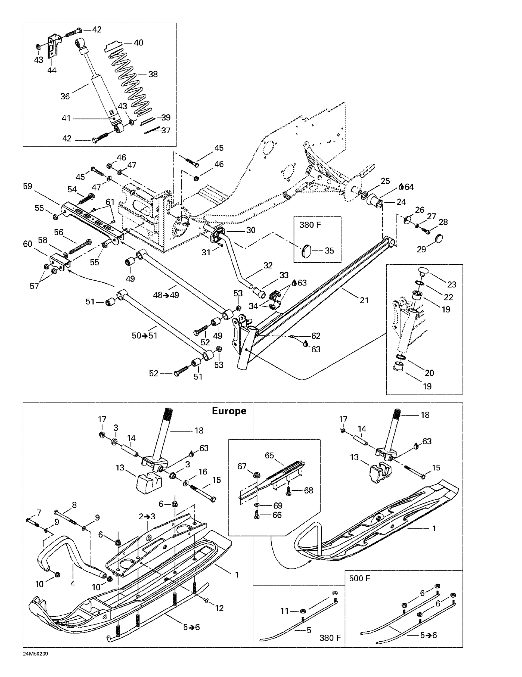 Ski-Doo Grand Touring 380 F/500 F, 2002 Front Suspension And Ski Diagram
