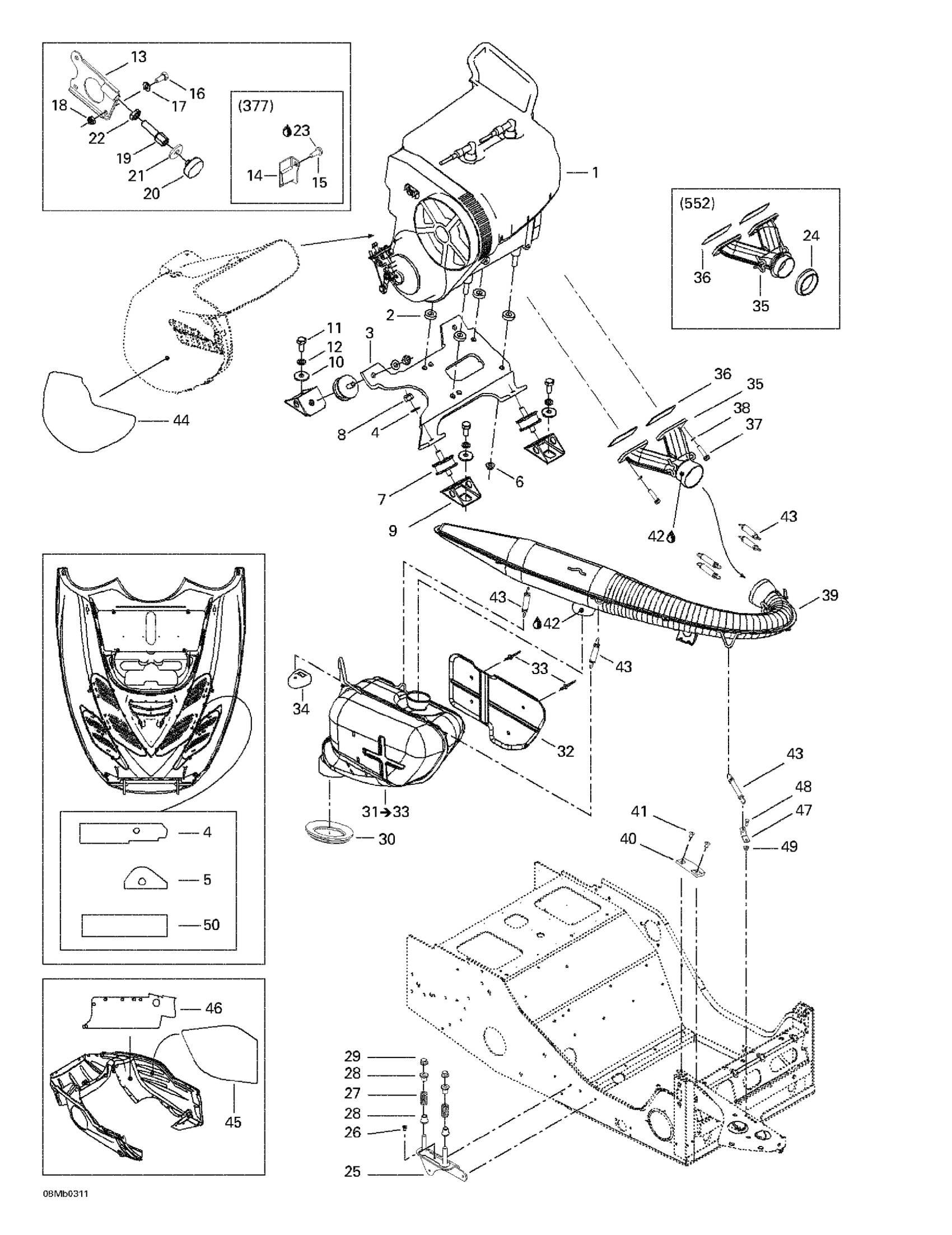 Ski-Doo Grand Touring 380 F/550 F, 2003 Engine Support And Muffler Diagram