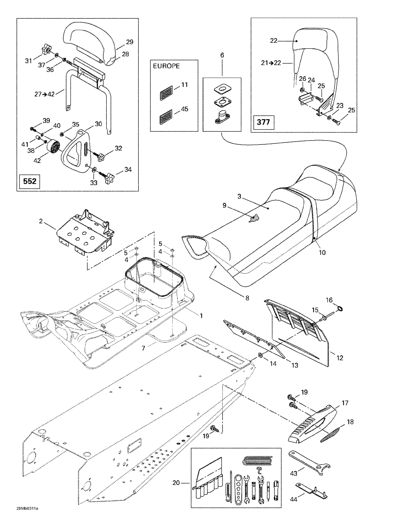 Ski-Doo Grand Touring 380 F/550 F, 2003 Seat And Accessories Diagram