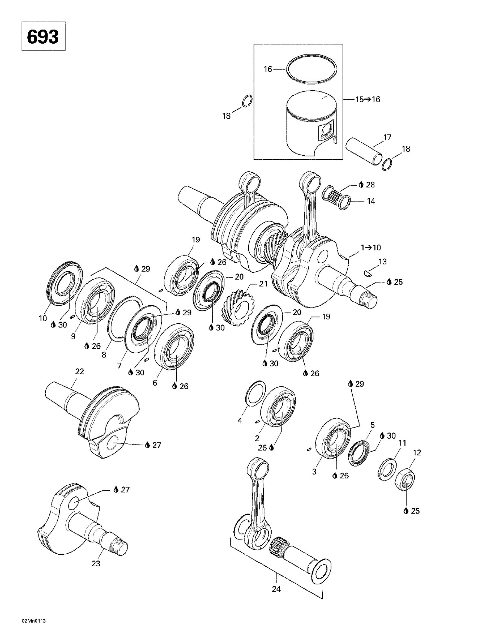 Ski-Doo Grand Touring 500/600/700, 2001 Crankshaft And Pistons (693) Diagram