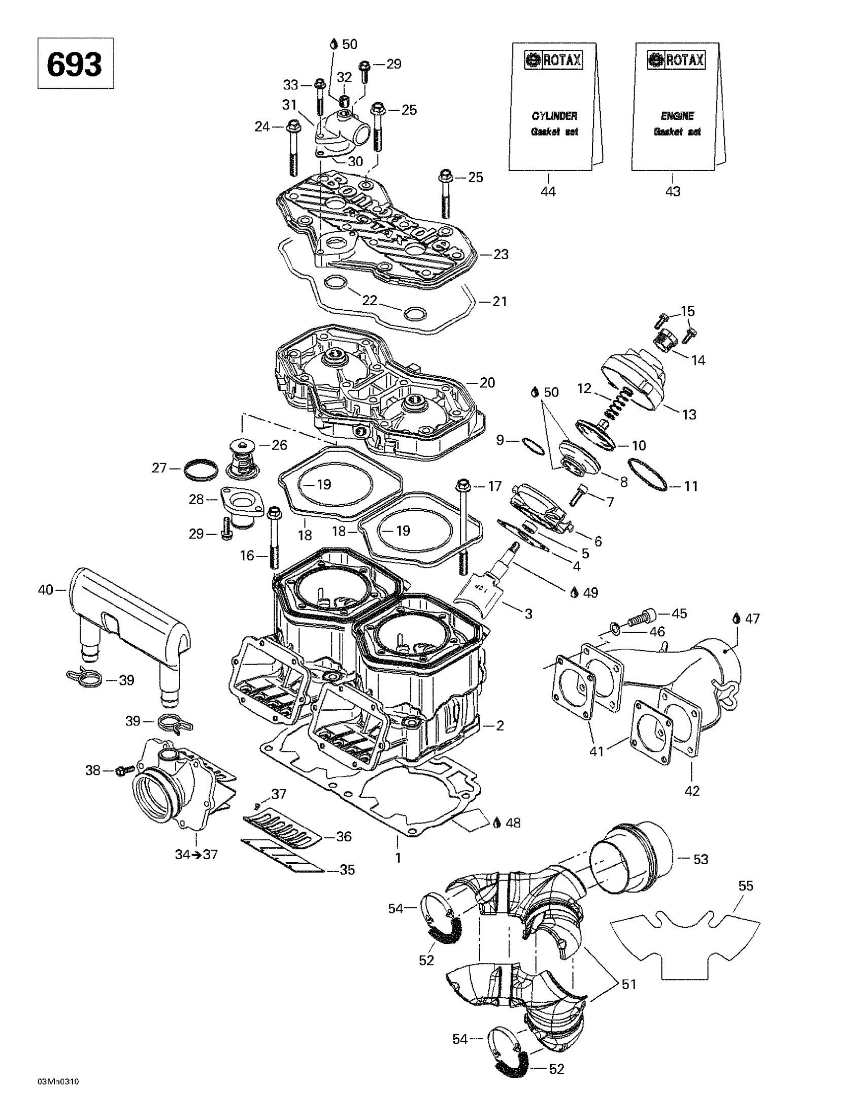 Ski-Doo Grand Touring 500/600/700, 2003 Cylinder, Exhaust Manifold, Reed Valve (693) Diagram