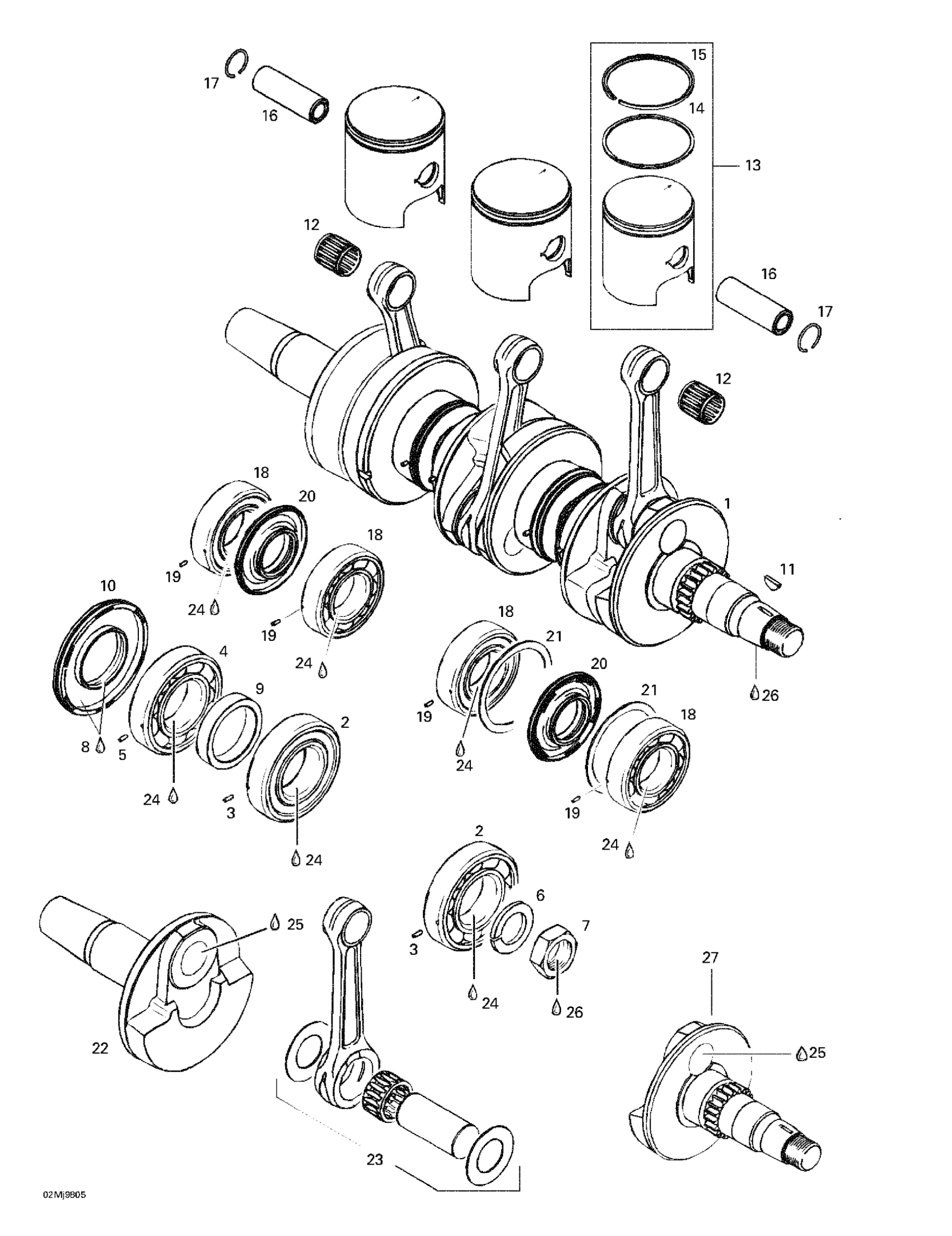 Ski-Doo Grand Touring 700, 1998 Crankshaft And Pistons Diagram