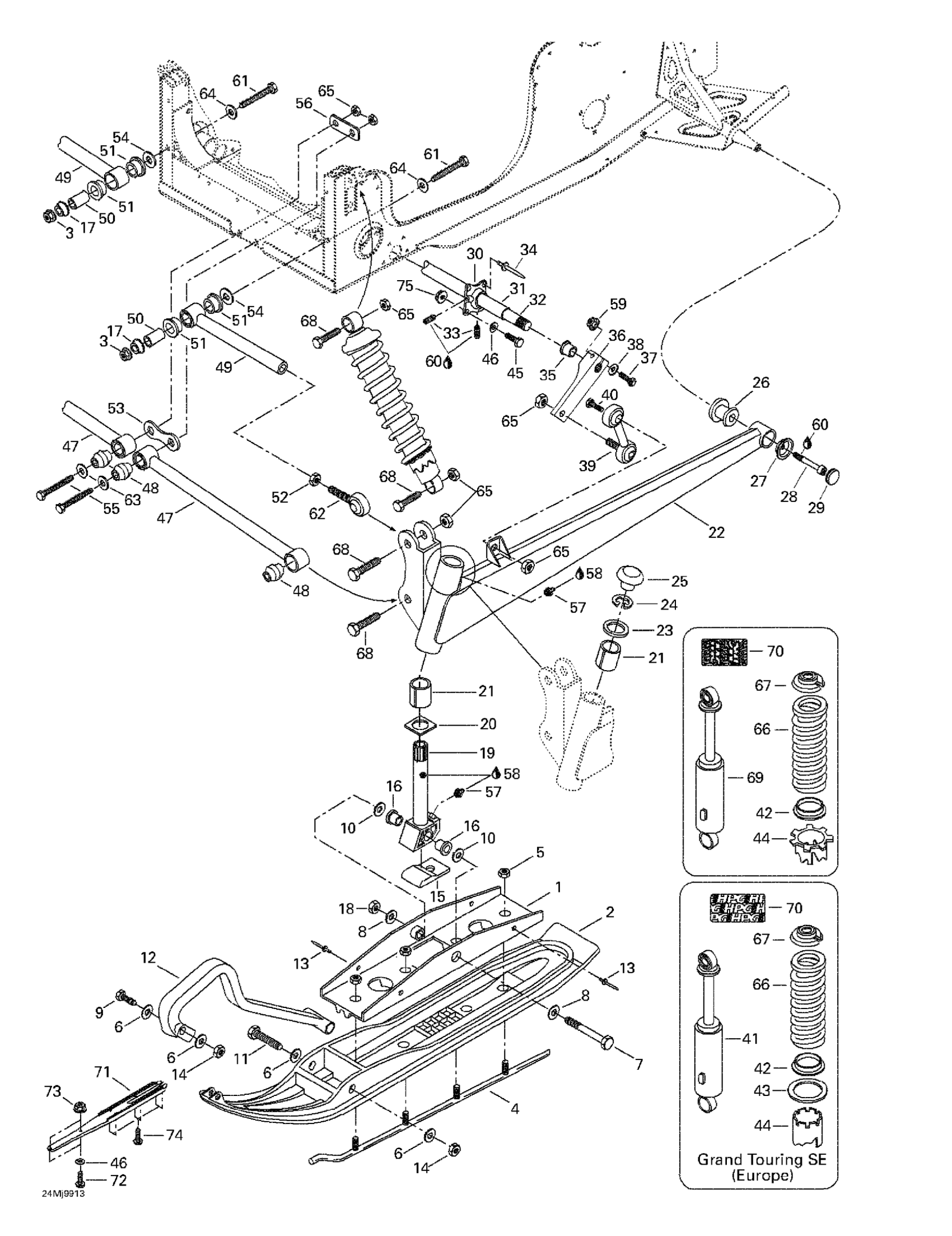 Ski-Doo Grand Touring 700, 1999 Front Suspension And Ski Diagram