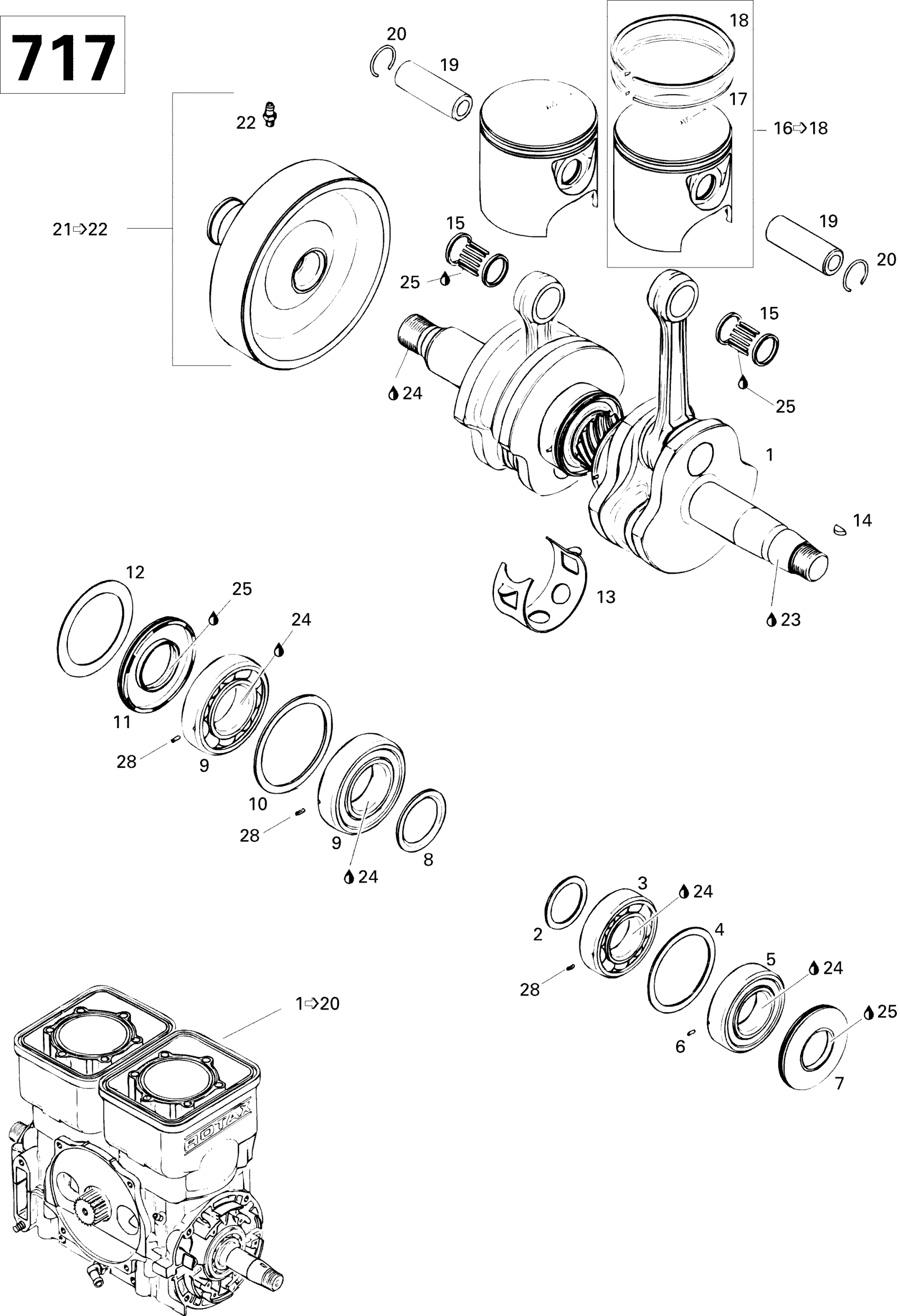 Sea-doo GTI, 5865, 1996 01- Crankshaft And Pistons 717 Diagram