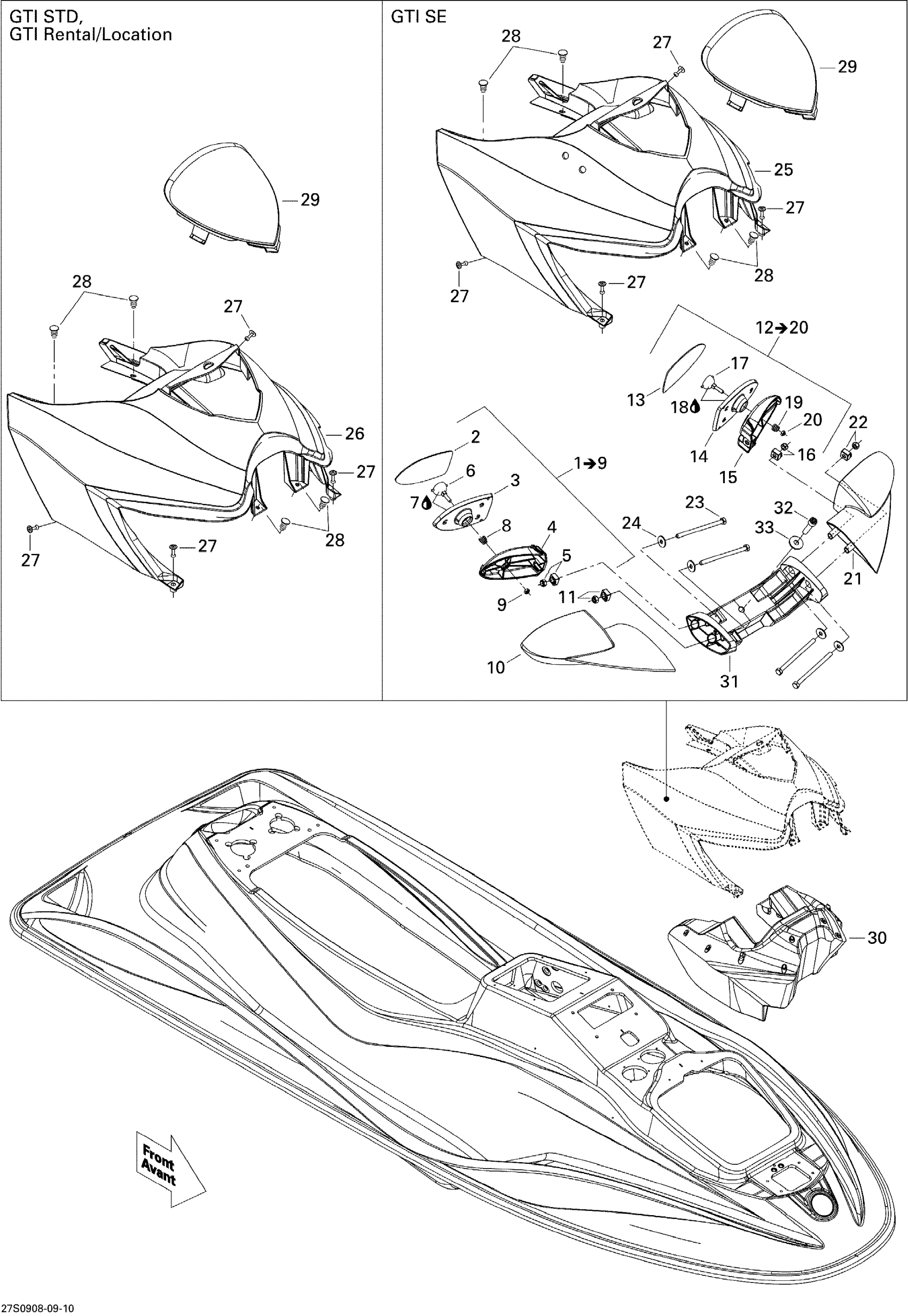 Sea-doo GTI SE 130, 2009 09- Body, Front View Diagram
