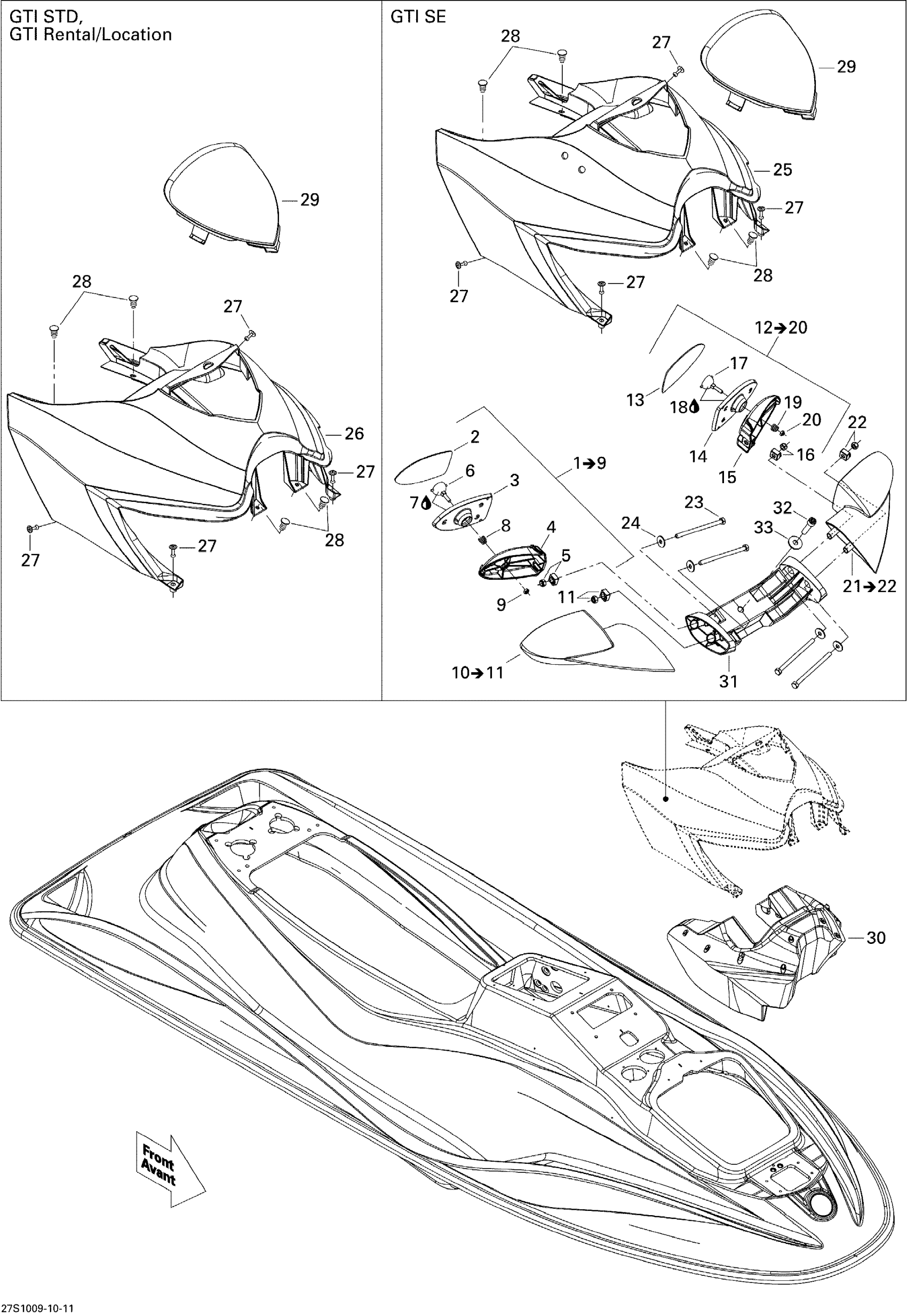 Sea-doo GTI SE 155, 2010 09- Body, Front View Diagram