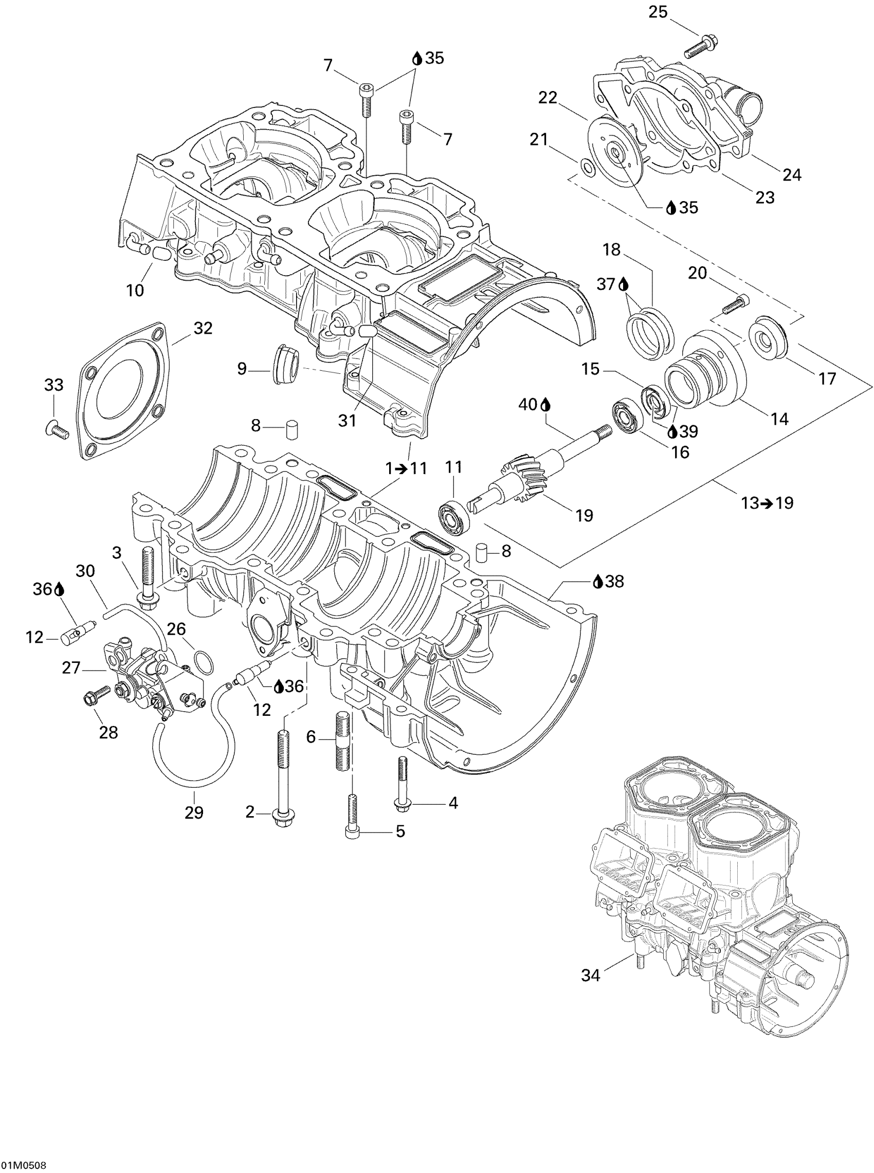 Ski-Doo GTX 600 HO SDI, 2005 Crankcase, Water Pump And Oil Pump Diagram