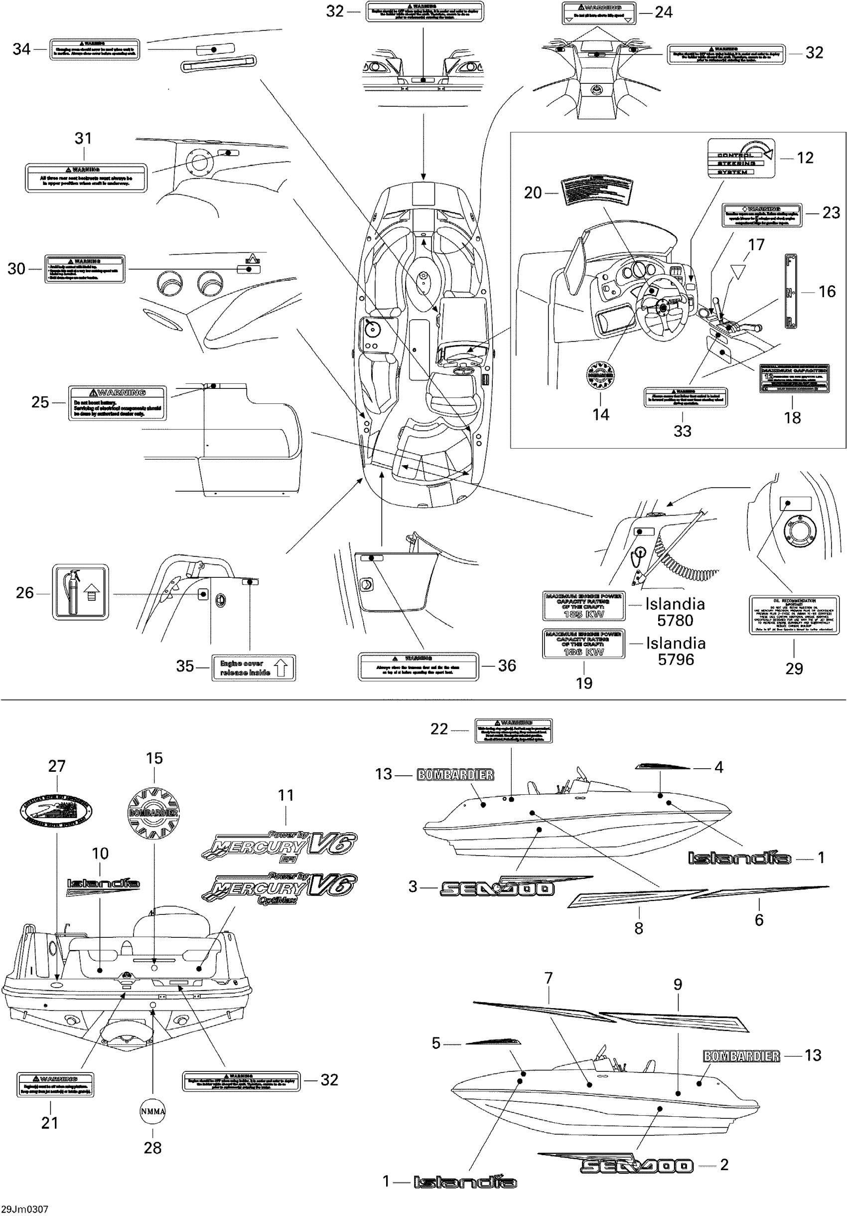 Sea-doo Islandia, 250 OPTI, 240 EFI, 2003 09- Decals Diagram