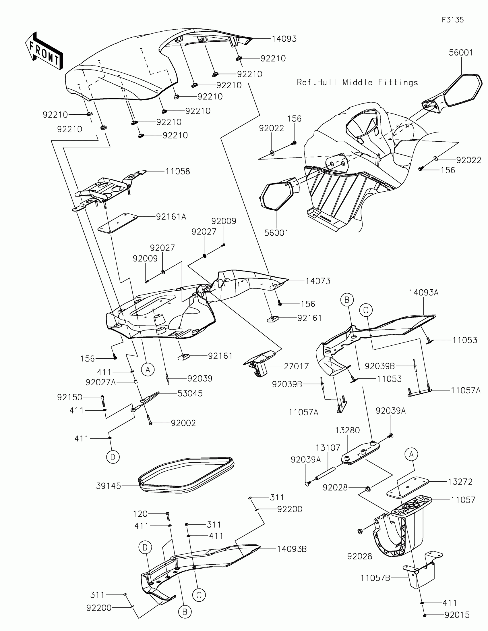 Kawasaki JET SKI® STX® 160LX Hull Front Fittings Diagram
