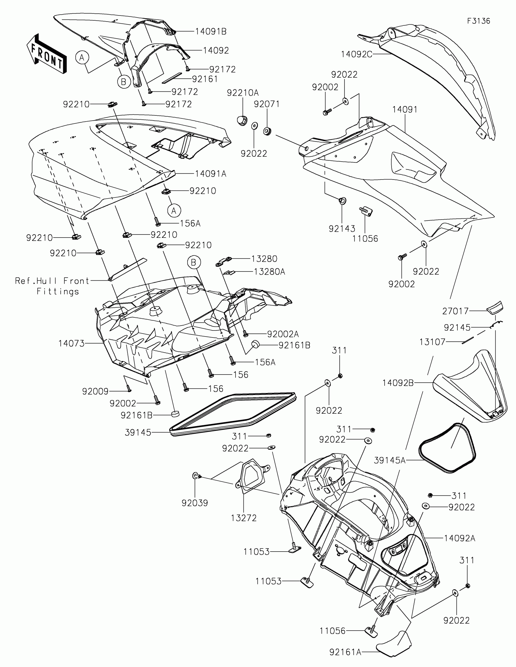 Kawasaki JET SKI® ULTRA® 310R Hull Middle Fittings Diagram