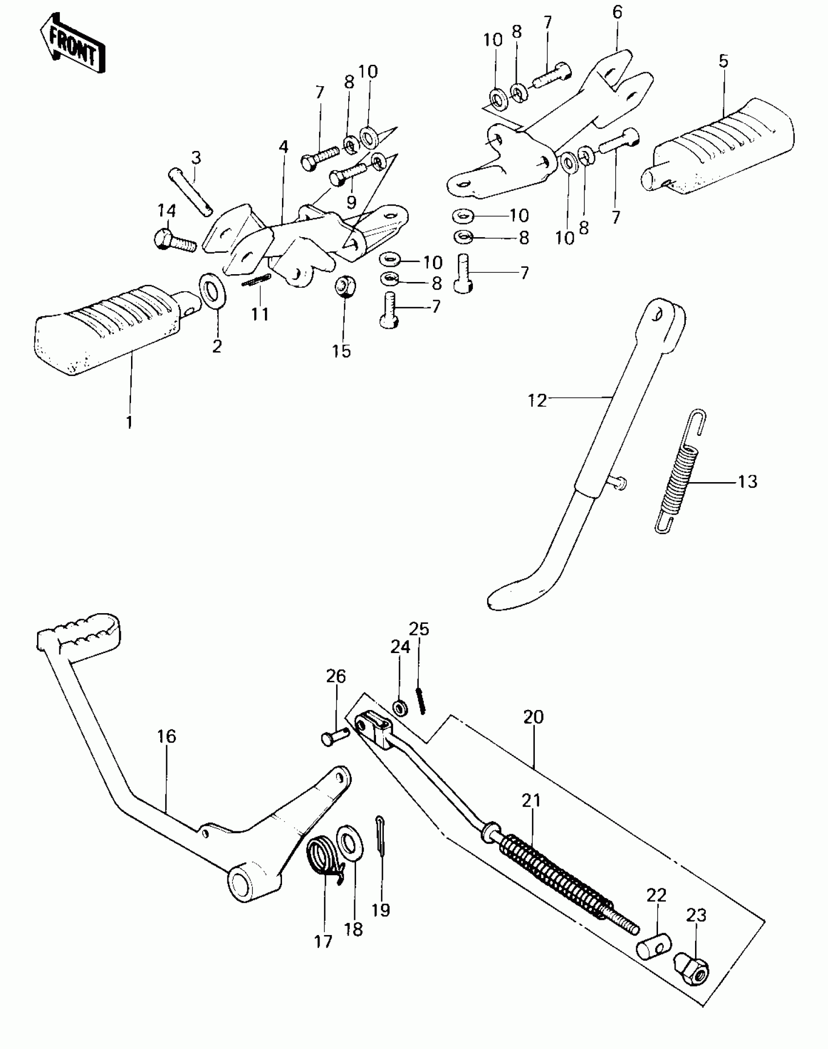 Kawasaki KE100 FOOTRESTS/STAND/BRAKE PEDAL Diagram