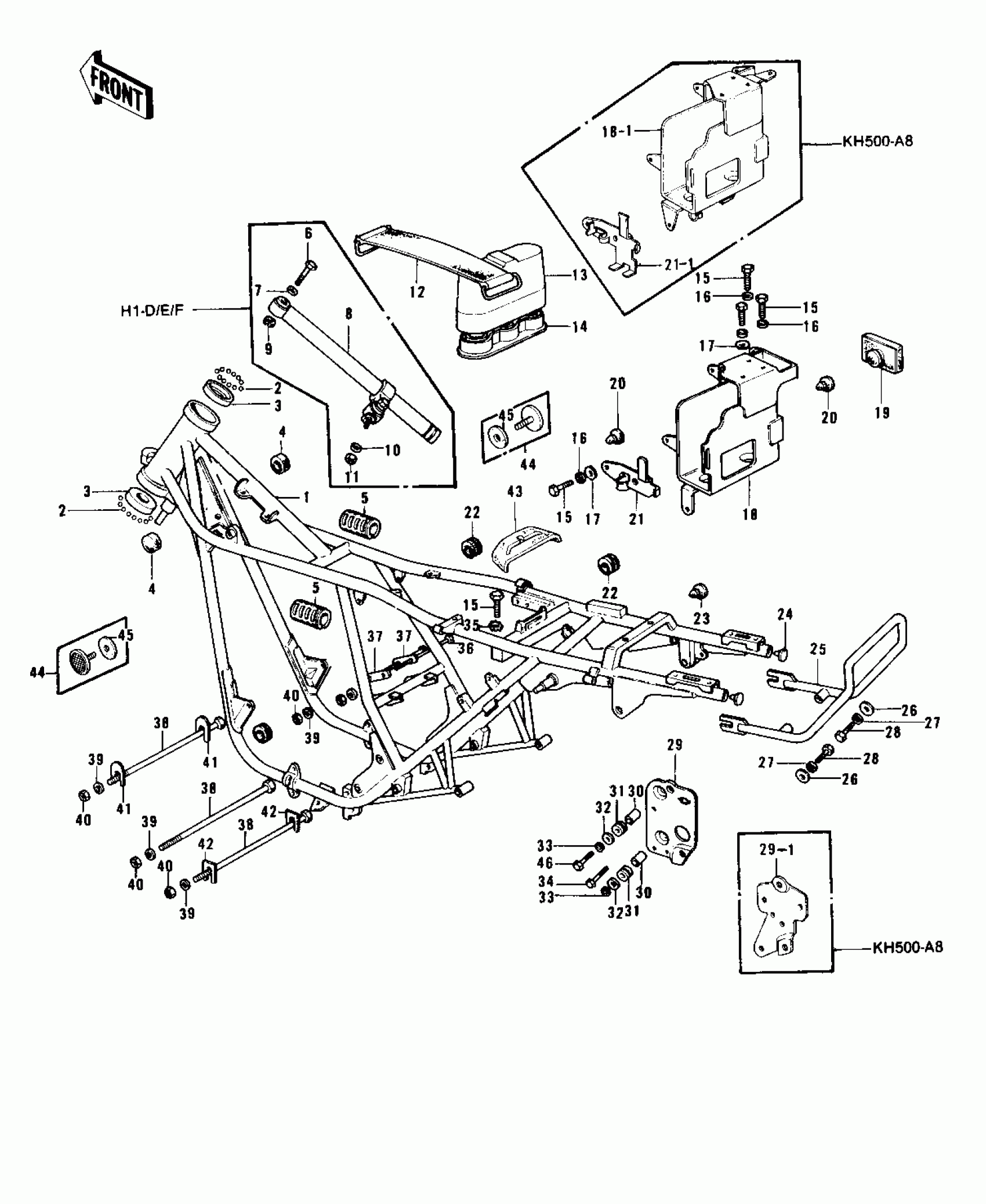 Kawasaki KH500-A8 FRAME/FRAME FITTINGS ('73-'75 D/E/F & '7 Diagram