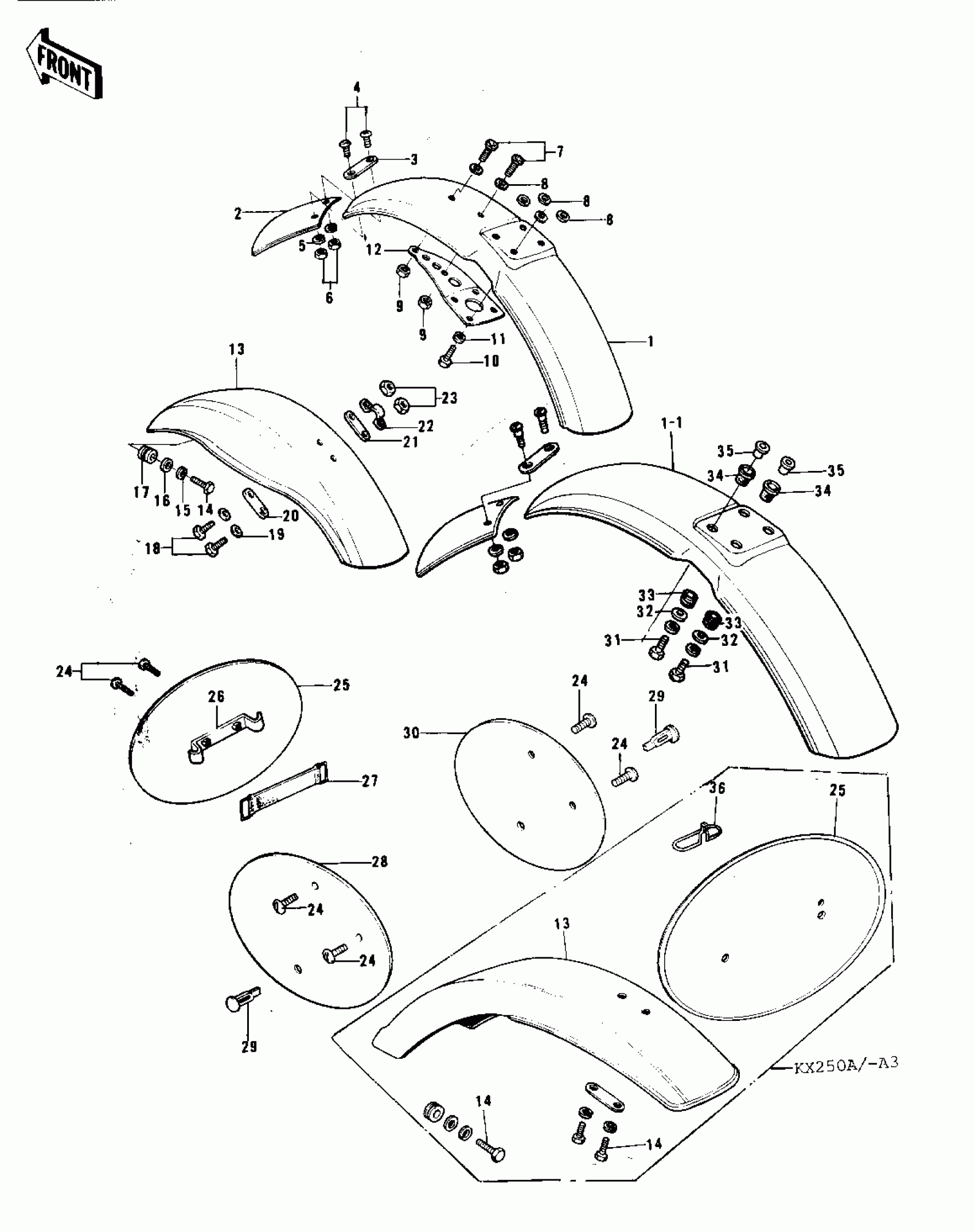 Kawasaki KX250-A3 FENDERS/NUMBER PLATES (74-76) Diagram