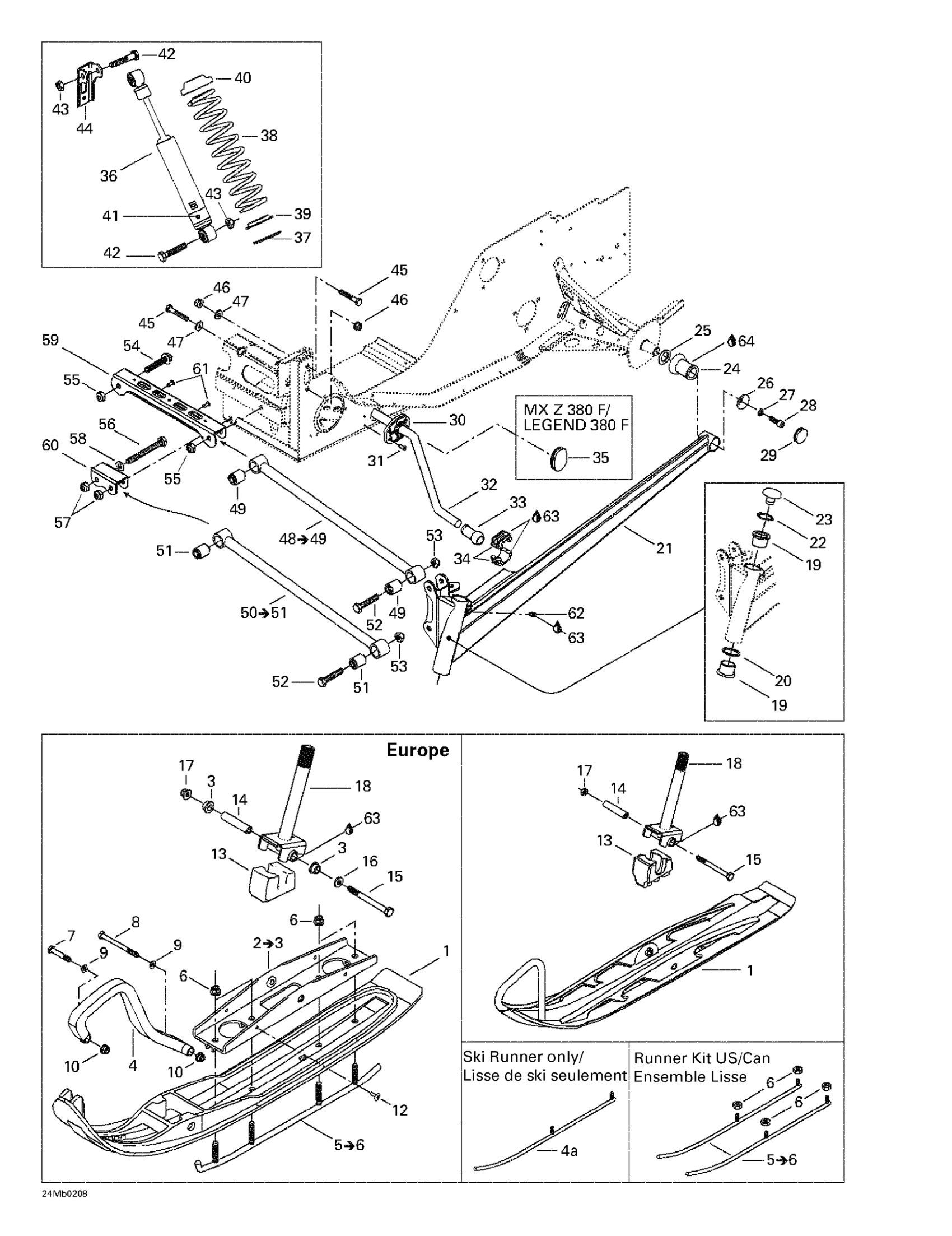 Ski-Doo Legend 380F/500F, 2002 Front Suspension And Ski Diagram