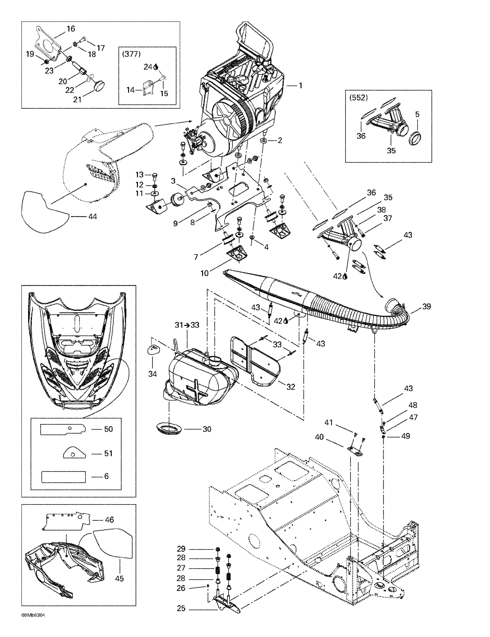 Ski-Doo Legend 380F/550F, 2003 Engine Support And Muffler Diagram