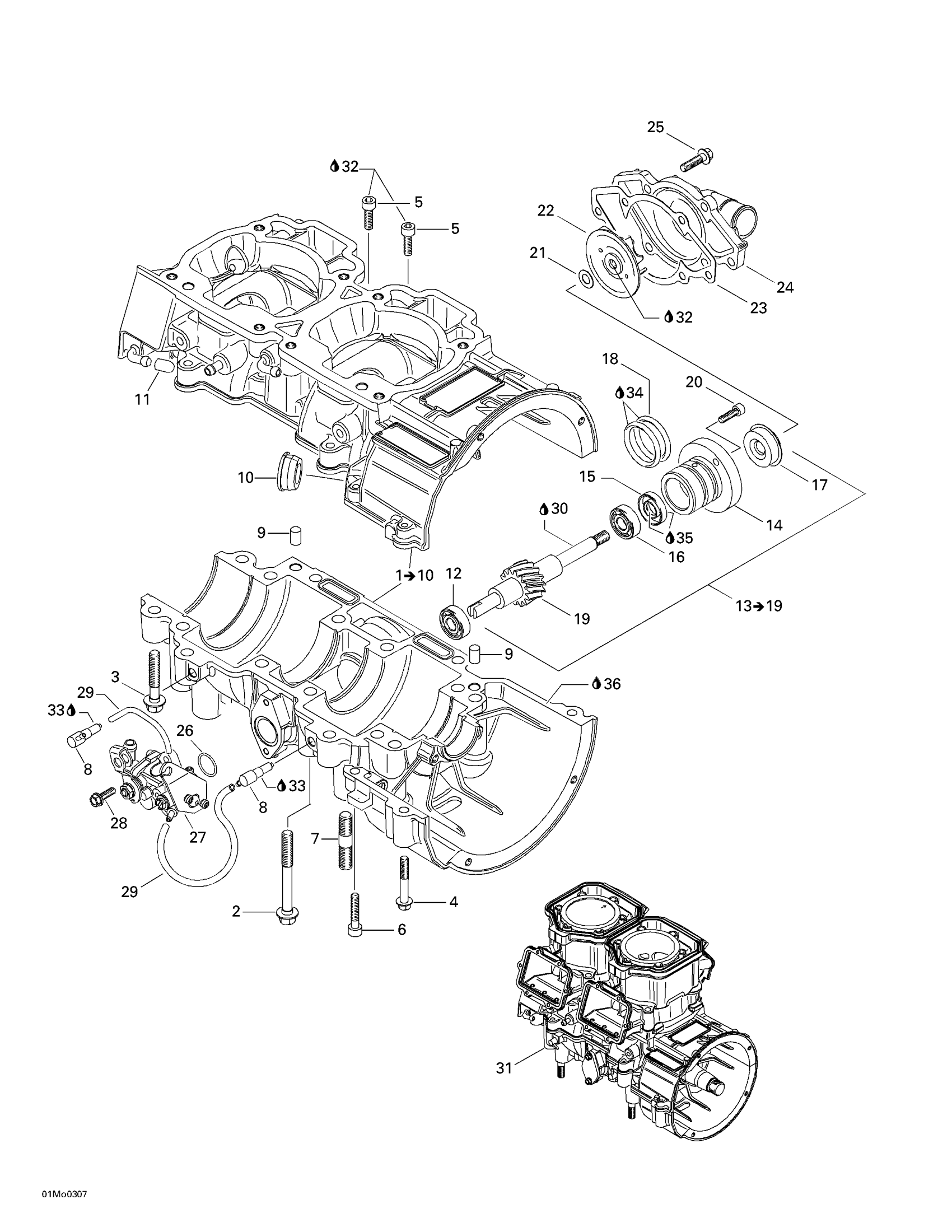 Ski-Doo Legend 500/600/700, 2003 Crankcase, Water Pump And Oil Pump Diagram