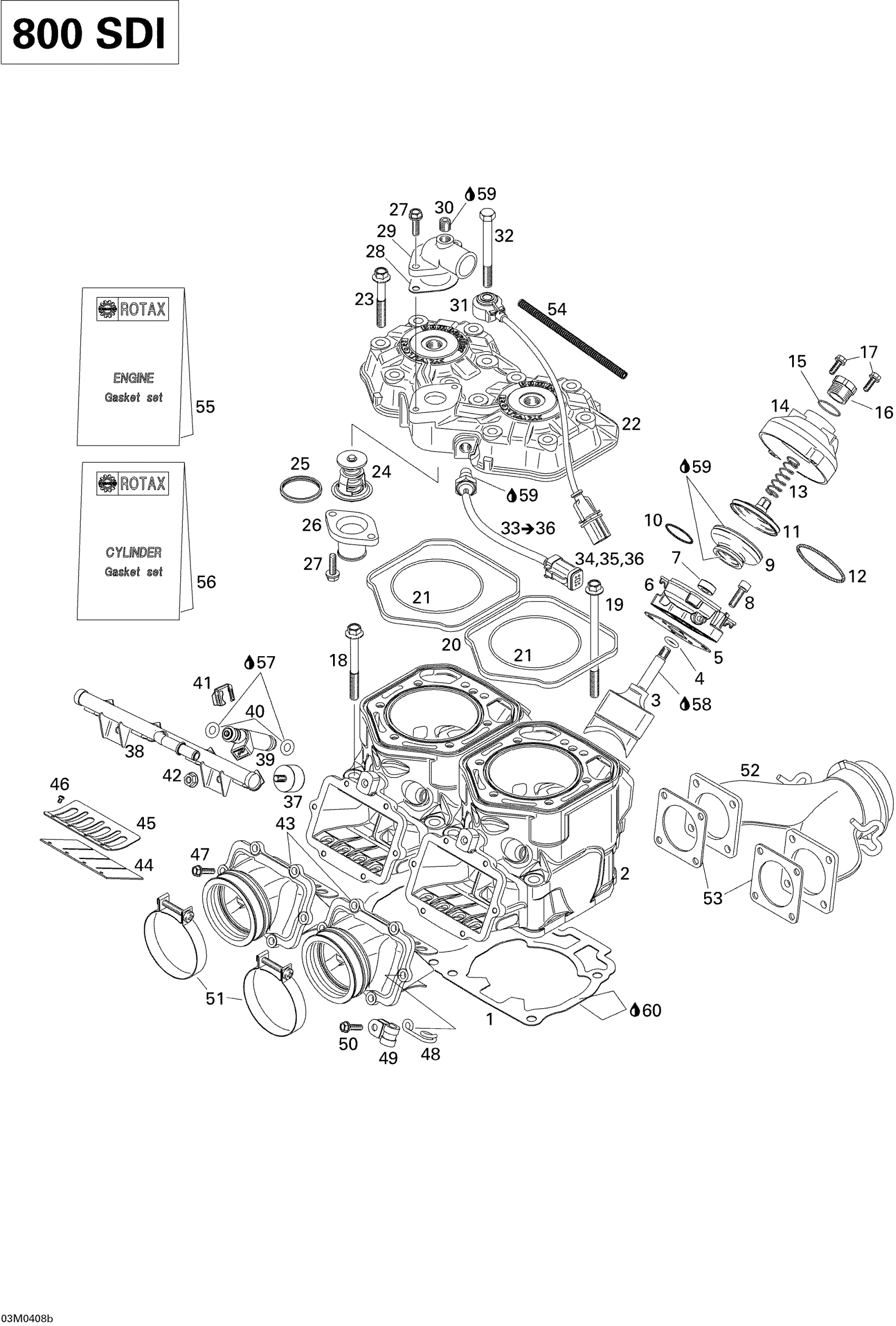 Ski-Doo Legend 800 SDI, 2004 Cylinder, Exhaust Manifold, Reed Valve (800) Diagram