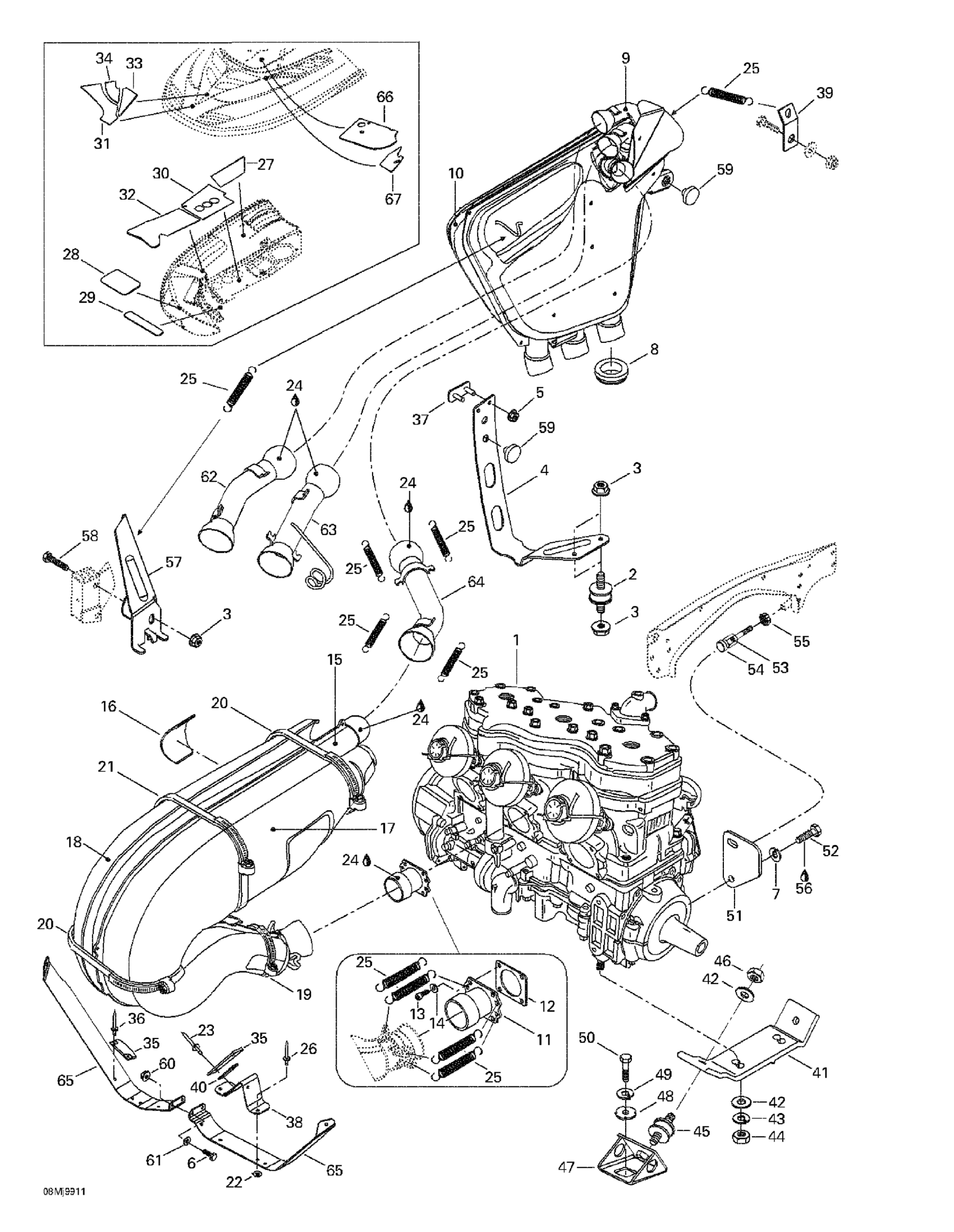 Ski-Doo Mach 1 R, 1999 Engine Support And Muffler Diagram